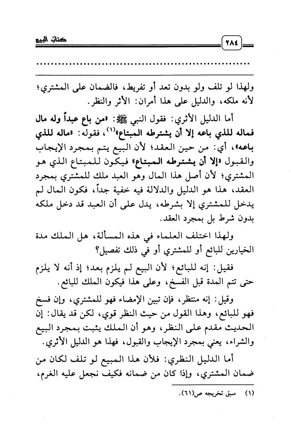 أما الدليل الأثري: فقول النبي صلّى الله عليه وسلّم: «من باع عبداً وله مال فماله للذي باعه إلا أن يشترطه المبتاع» (¬1)، فقوله: «ماله للذي باعه»، أي: من حين العقد؛ لأن البيع يتم بمجرد الإيجاب والقبول «إلا أن يشترطه المبتاع» فيكون للمبتاع الذي هو المشتري؛ لأن أصل هذا المال وهو العبد ملك للمشتري بمجرد العقد، هذا هو الدليل والدلالة فيه خفية جداً، فكون المال لم يدخل للمشتري إلا بشرطه، يدل على أن العبد قد دخل ملكه بدون شرط بل بمجرد العقد.