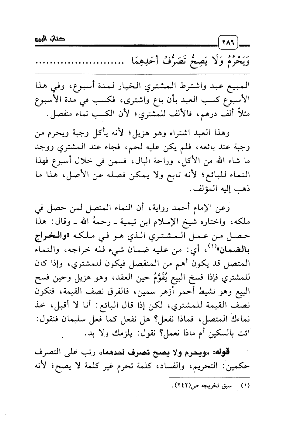 وعن الإمام أحمد رواية، أن النماء المتصل لمن حصل في ملكه، واختاره شيخ الإسلام ابن تيمية ـ رحمه الله ـ وقال: هذا حصل من عمل المشتري الذي هو في ملكه «والخراج بالضمان» (¬1)، أي: من عليه ضمان شيء فله خراجه، والنماء المتصل قد يكون أهم من المنفصل فيكون للمشتري، وإذا كان للمشتري فإذا فسخ البيع يُقَوَّمُ حين العقد، وهو هزيل وحين فسخ البيع وهو نشيط أحمر أزهر سمين، فالفرق نصف القيمة، فتكون نصف القيمة للمشتري، لكن إذا قال البائع: أنا لا أقبل، خذ نماءك المتصل، فماذا نفعل؟ هل نفعل كما فعل سليمان فنقول: ائت بالسكين أم ماذا نعمل؟ نقول: يلزمك ولا بد.