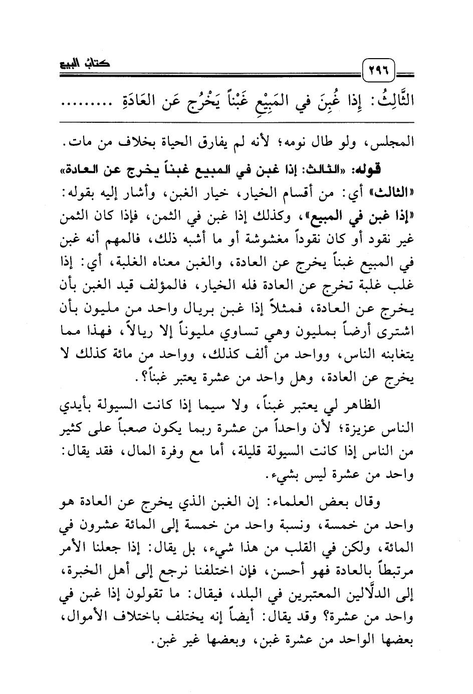 قوله: «الثالث: إذا غبن في المبيع غبناً يخرج عن العادة» «الثالث» أي: من أقسام الخيار، خيار الغبن، وأشار إليه بقوله: «إذا غبن في المبيع»، وكذلك إذا غبن في الثمن، فإذا كان الثمن غير نقود أو كان نقوداً مغشوشة أو ما أشبه ذلك، فالمهم أنه غبن في المبيع غبناً يخرج عن العادة، والغبن معناه الغلبة، أي: إذا غلب غلبة تخرج عن العادة فله الخيار، فالمؤلف قيد الغبن بأن يخرج عن العادة، فمثلاً إذا غبن بريال واحد من مليون بأن اشترى أرضاً بمليون وهي تساوي مليوناً إلا ريالاً، فهذا مما يتغابنه الناس، وواحد من ألف كذلك، وواحد من مائة كذلك لا يخرج عن العادة، وهل واحد من عشرة يعتبر غبناً؟.