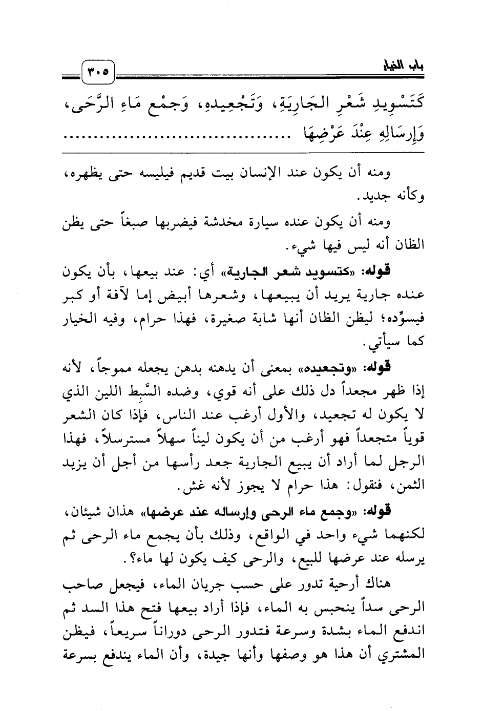 قوله: «وجمع ماء الرحى وإرساله عند عرضها» هذان شيئان، لكنهما شيء واحد في الواقع، وذلك بأن يجمع ماء الرحى ثم يرسله عند عرضها للبيع، والرحى كيف يكون لها ماء؟.