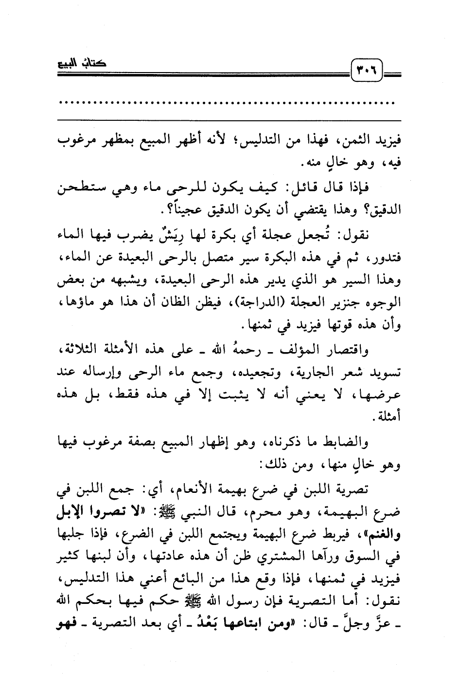 تصرية اللبن في ضرع بهيمة الأنعام، أي: جمع اللبن في ضرع البهيمة، وهو محرم، قال النبي صلّى الله عليه وسلّم: «لا تصروا الإبل والغنم»، فيربط ضرع البهيمة ويجتمع اللبن في الضرع، فإذا جلبها في السوق ورآها المشتري ظن أن هذه عادتها، وأن لبنها كثير فيزيد في ثمنها، فإذا وقع هذا من البائع أعني هذا التدليس، نقول: أما التصرية فإن رسول الله صلّى الله عليه وسلّم حكم فيها بحكم الله ـ عزّ وجل ـ قال: «ومن ابتاعها بَعْدُ ـ أي بعد التصرية ـ فهو