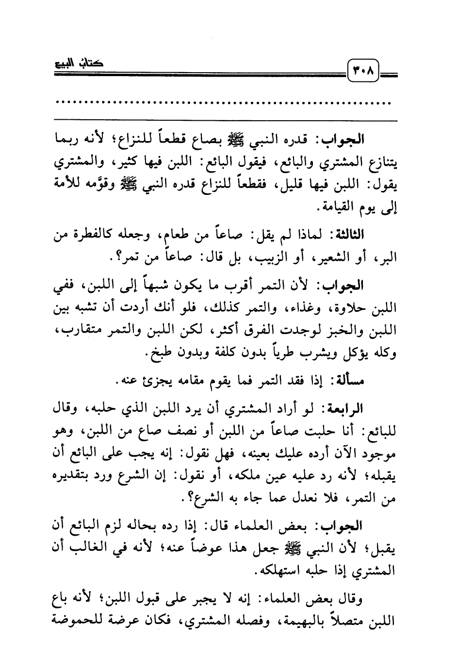 الجواب: قدره النبي صلّى الله عليه وسلّم بصاع قطعاً للنزاع؛ لأنه ربما يتنازع المشتري والبائع، فيقول البائع: اللبن فيها كثير، والمشتري يقول: اللبن فيها قليل، فقطعاً للنزاع قدره النبي صلّى الله عليه وسلّم وقوَّمه للأمة إلى يوم القيامة.