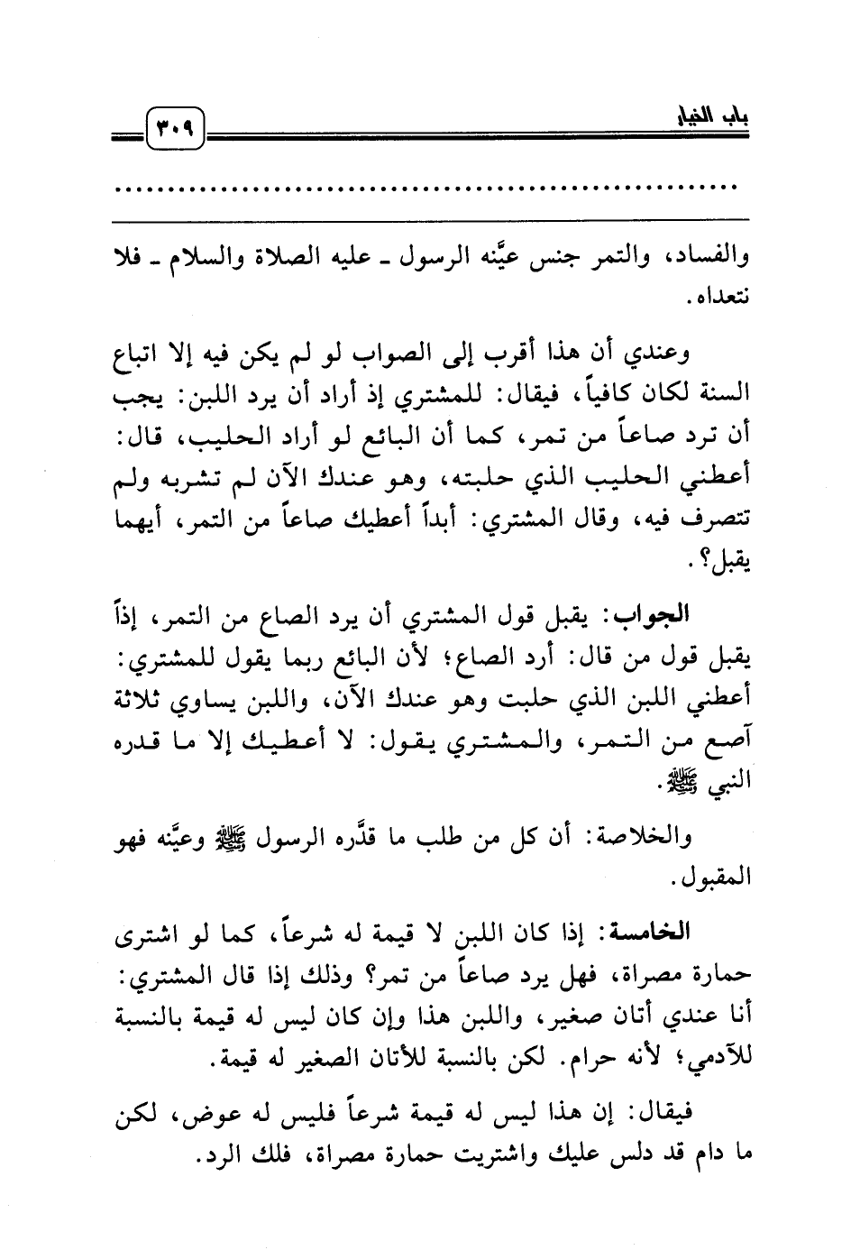 وعندي أن هذا أقرب إلى الصواب لو لم يكن فيه إلا اتباع السنة لكان كافياً، فيقال: للمشتري إذ أراد أن يرد اللبن: يجب أن ترد صاعاً من تمر، كما أن البائع لو أراد الحليب، قال: أعطني الحليب الذي حلبته، وهو عندك الآن لم تشربه ولم تتصرف فيه، وقال المشتري: أبداً أعطيك صاعاً من التمر، أيهما يقبل؟.