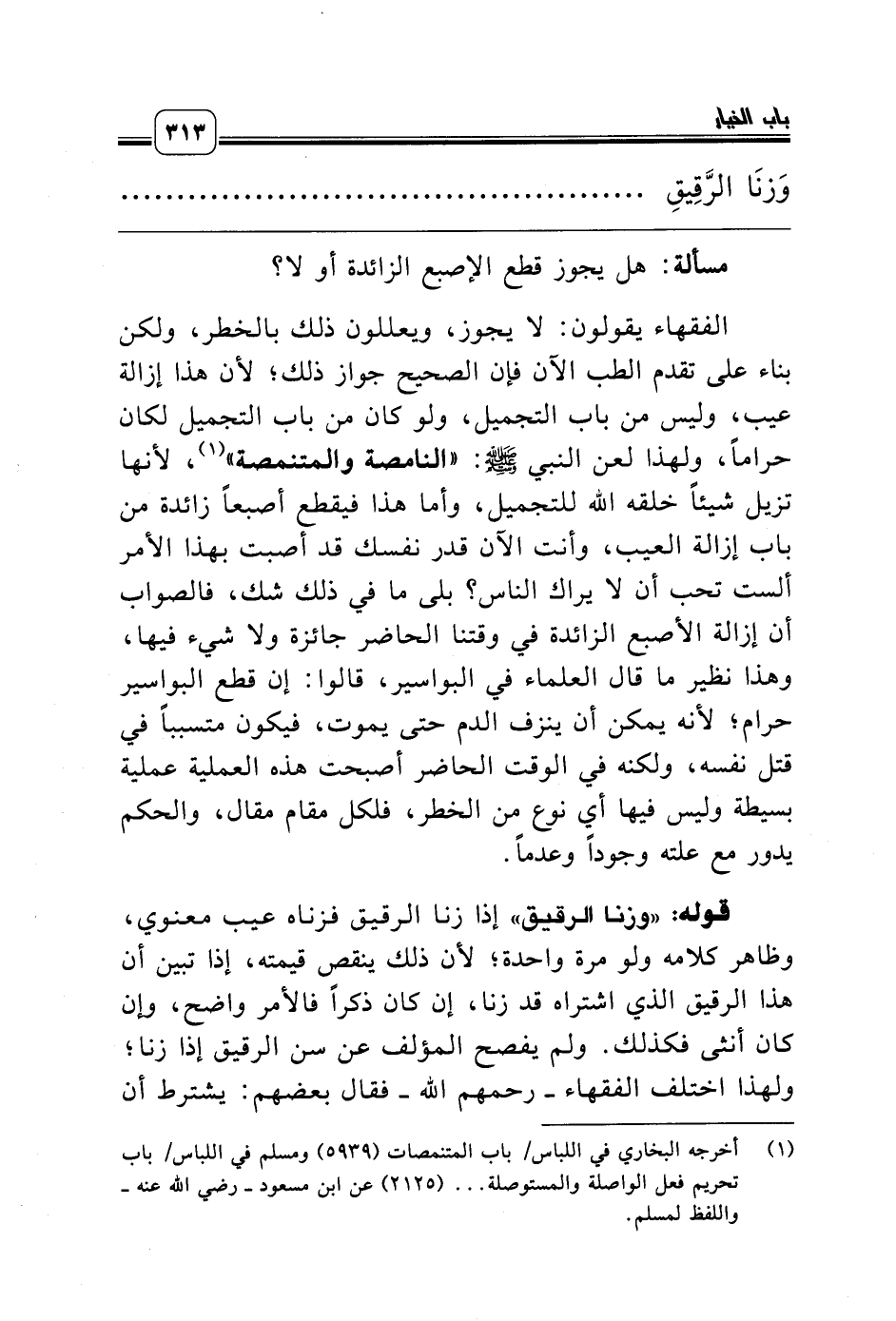 الفقهاء يقولون: لا يجوز، ويعللون ذلك بالخطر، ولكن بناء على تقدم الطب الآن فإن الصحيح جواز ذلك؛ لأن هذا إزالة عيب، وليس من باب التجميل، ولو كان من باب التجميل لكان حراماً، ولهذا لعن النبي صلّى الله عليه وسلّم: «النامصة والمتنمصة» (¬1)، لأنها تزيل شيئاً خلقه الله للتجميل، وأما هذا فيقطع أصبعاً زائدة من باب إزالة العيب، وأنت الآن قدر نفسك قد أصبت بهذا الأمر ألست تحب أن لا يراك الناس؟ بلى ما في ذلك شك، فالصواب أن إزالة الأصبع الزائدة في وقتنا الحاضر جائزة ولا شيء فيها، وهذا نظير ما قال العلماء في البواسير، قالوا: إن قطع البواسير حرام؛ لأنه يمكن أن ينزف الدم حتى يموت، فيكون متسبباً في قتل نفسه، ولكنه في الوقت الحاضر أصبحت هذه العملية عملية بسيطة وليس فيها أي نوع من الخطر، فلكل مقام مقال، والحكم يدور مع علته وجوداً وعدماً.
