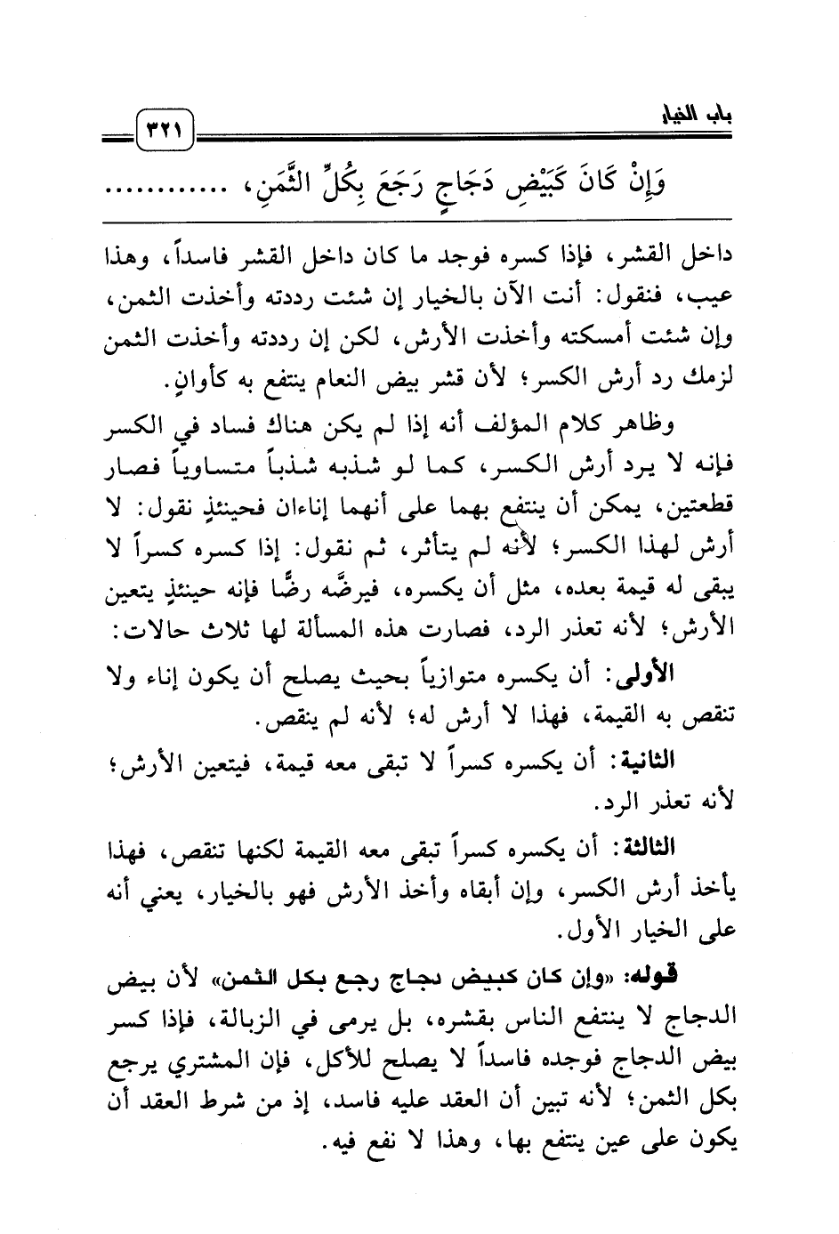 داخل القشر، فإذا كسره فوجد ما كان داخل القشر فاسداً، وهذا عيب، فنقول: أنت الآن بالخيار إن شئت رددته وأخذت الثمن، وإن شئت أمسكته وأخذت الأرش، لكن إن رددته وأخذت الثمن لزمك رد أرش الكسر؛ لأن قشر بيض النعام ينتفع به كأوانٍ.