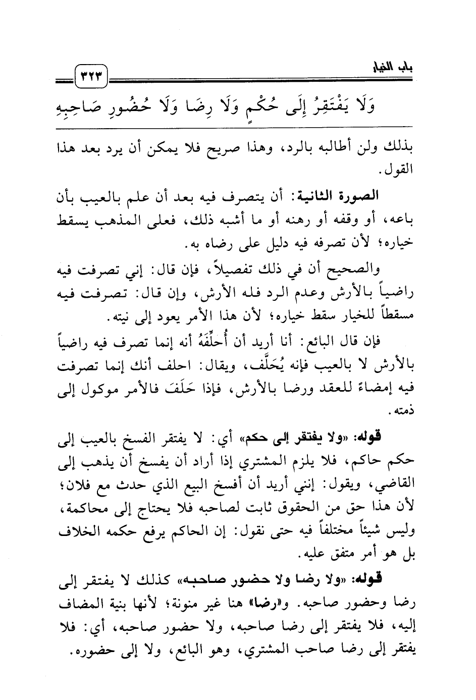 قوله: «ولا يفتقر إلى حكم» أي: لا يفتقر الفسخ بالعيب إلى حكم حاكم، فلا يلزم المشتري إذا أراد أن يفسخ أن يذهب إلى القاضي، ويقول: إنني أريد أن أفسخ البيع الذي حدث مع فلان؛ لأن هذا حق من الحقوق ثابت لصاحبه فلا يحتاج إلى محاكمة، وليس شيئاً مختلفاً فيه حتى نقول: إن الحاكم يرفع حكمه الخلاف بل هو أمر متفق عليه.