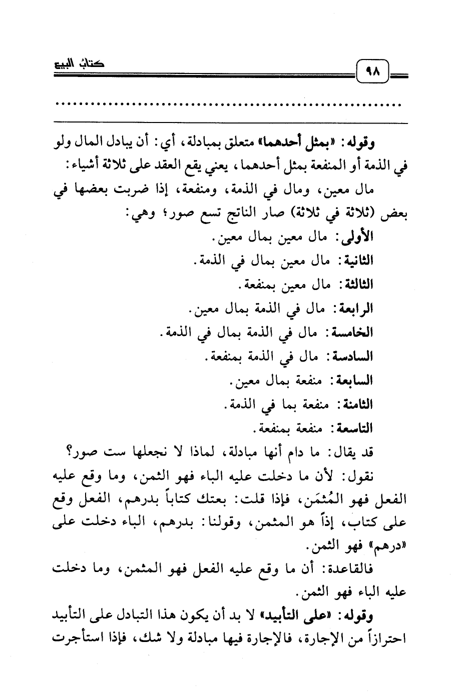 مال معين، ومال في الذمة، ومنفعة، إذا ضربت بعضها في بعض (ثلاثة في ثلاثة) صار الناتج تسع صور؛ وهي: