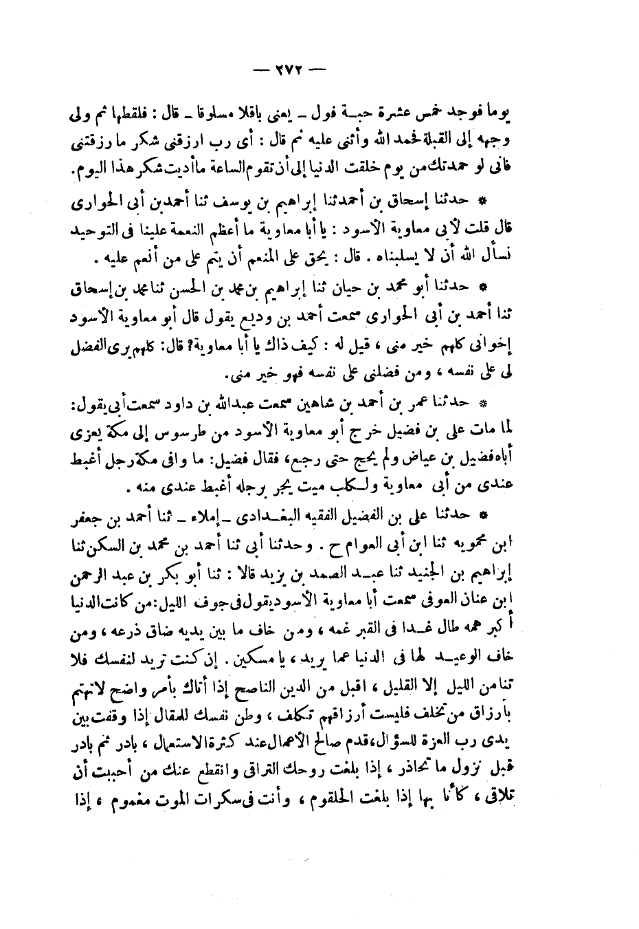 حَدَّثَنَا عَلِيُّ بْنُ الْفُضَيْلِ الْفَقِيهُ الْبَغْدَادِيُّ، إِمْلَاءً , ثنا أَحْمَدُ بْنُ جَعْفَرِ بْنِ مَحْمَوَيْهِ , ثنا ابْنُ أَبِي الْعَوَّامِ، ح. وَحَدَّثَنَا أَبِي , ثنا أَحْمَدُ بْنُ مُحَمَّدِ بْنِ السَّكَنِ , ثنا إِبْرَاهِيمُ بْنُ الْجُنَيْدِ , ثنا عَبْدُ الصَّمَدِ بْنُ يَزِيدَ , قَالَا: ثنا أَبُو بَكْرِ بْنُ عَبْدِ الرَّحْمَنِ بْنِ عَنَانَ الْعَوْفِيُّ، سَمِعْتُ أَبَا مُعَاوِيَةَ الْأَسْوَدَ , يَقُولُ فِي جَوْفِ اللَّيْلِ: " §مَنْ كَانَتِ الدُّنْيَا أَكْبَرَ هَمِّهِ طَالَ غَدًا فِي الْقَبْرِ غَمُّهُ وَمَنْ خَافَ مَا بَيْنَ يَدَيْهِ ضَاقَ ذَرْعُهُ، وَمَنْ خَافَ الْوَعِيدَ لَهَى فِي الدُّنْيَا عَمَّا يُرِيدُ , يَا مِسْكِينُ، إِنْ كُنْتَ تُرِيدُ لِنَفْسِكَ فَلَا تَنَامَنَّ اللَّيْلَ إِلَّا الْقَلِيلَ اقْبَلْ مِنَ الدِّينِ النَّاصِحَ إِذَا أَتَاكَ بِأَمْرٍ وَاضِحٍ لَا تَهْتَمَّ بِأَرْزَاقِ مَنْ تُخَلِّفُ فَلَيْسَتْ أَرْزَاقُهُمْ تُكَلِّفُ، وَطِّنْ نَفْسَكَ لِلْمَقَالِ إِذَا وَقَفْتَ بَيْنَ يَدَيْ رَبِّ الْعِزَّةِ لِلسُّؤَالِ، قَدِّمْ صَالِحَ الْأَعْمَالِ عِنْدَ كَثْرَةِ الِاسْتِعْمَالِ , بَادِرْ ثُمَّ بَادِرْ , قَبْلَ نُزُولِ مَا تُحَاذِرُ إِذَا بَلَغَتْ رُوحُكَ التَّرَاقِيَ وَانْقَطَعَ عَنْكَ مَنْ أَحْبَبْتَ أَنْ تُلَاقِيَ كَأَنِّي بِهَا إِذَا بَلَغَتِ الْحُلْقُومَ وَأَنْتَ فِي سَكَرَاتِ الْمَوْتِ مَغْمُومٌ، إِذَا -[273]- انْقَطَعَتْ حَاجَتُكَ إِلَى أَهْلِكَ , وَأَنْتَ تَرَاهُمْ حَوْلَكَ وَقَدْ بَقَيْتَ مُرْتَهِنًا بِعَمَلِكَ , فَالصَّبْرُ مِلَاكُ الْأَمْرِ وَفِيهِ أَعْظَمُ الْأَجْرِ , فَاجْعَلْ ذِكْرَ اللهِ مِنْ أَجَّلِّ شَأْنِكَ وَامْلِكْ فِيمَا يَنْوِي ذَلِكَ لِسَانَكُ ثُمَّ بَكَى أَبُو مُعَاوِيَةَ بُكَاءً شَدِيدًا , ثُمَّ قَالَ: أَوْهِ مِنْ يَوْمٍ يَتَغَيَّرُ فِيهِ لَوْنِي وَيَتَلَجْلَجُ فِيهِ لِسَانِي وَيَقِلُّ فِيهِ زَادِي. فَقِيلَ: يَا أَبَا مُعَاوِيَةَ مَنْ قَالَ هَذَا الْكَلَامَ الْحَسَنَ الْجَمِيلَ؟ قَالَ: حَكِيمٌ مِنَ الْحُكَمَاءِ. الْمَسَاقُ لِعَلِيِّ بْنِ الْفُضَيْلِ