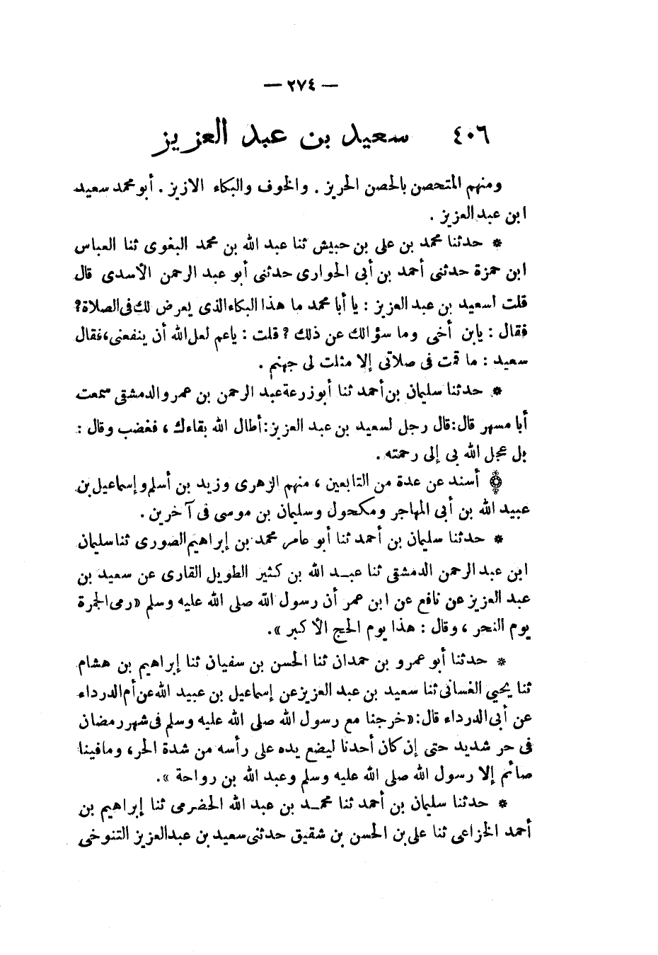 حَدَّثَنَا مُحَمَّدُ بْنُ عَلِيِّ بْنِ حُبَيْشٍ , ثنا عَبْدُ اللهِ بْنُ مُحَمَّدٍ الْبَغَوِيُّ , ثنا الْعَبَّاسُ بْنُ حَمْزَةَ , حَدَّثَنِي أَحْمَدُ بْنُ أَبِي الْحَوَارِيِّ , حَدَّثَنِي أَبُو عَبْدِ الرَّحْمَنِ الْأَسَدِيُّ , قَالَ: قُلْتُ لِسَعِيدِ بْنِ عَبْدِ الْعَزِيزِ: يَا أَبَا مُحَمَّدٍ , مَا هَذَا الْبُكَاءُ الَّذِي يَعْرِضُ لَكَ فِي الصَّلَاةِ؟ فَقَالَ: يَا ابْنَ أَخِي وَمَا سُؤَالُكَ عَنْ ذَلِكَ؟ قُلْتُ: يَا عَمُّ لَعَلَّ اللهَ أَنْ يَنْفَعَنِي، فَقَالَ سَعِيدٌ: «§مَا قُمْتُ فِي صَلَاتِي إِلَّا مُثِّلَتْ لِي جَهَنَّمُ»