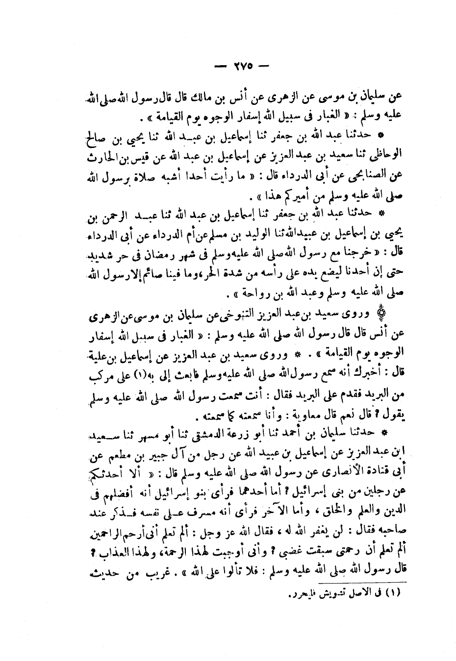 وَرَوَى سَعِيدُ بْنُ عَبْدِ الْعَزِيزِ التَّنُوخِيُّ، عَنْ سُلَيْمَانَ بْنِ مُوسَى، عَنِ الزُّهْرِيِّ، عَنْ أَنَسٍ، قَالَ: قَالَ رَسُولُ اللهِ صَلَّى اللهُ عَلَيْهِ وَسَلَّمَ: «§الْغُبَارُ فِي سَبِيلِ اللهِ إِسْفَارُ الْوُجُوهِ يَوْمَ الْقِيَامَةِ»