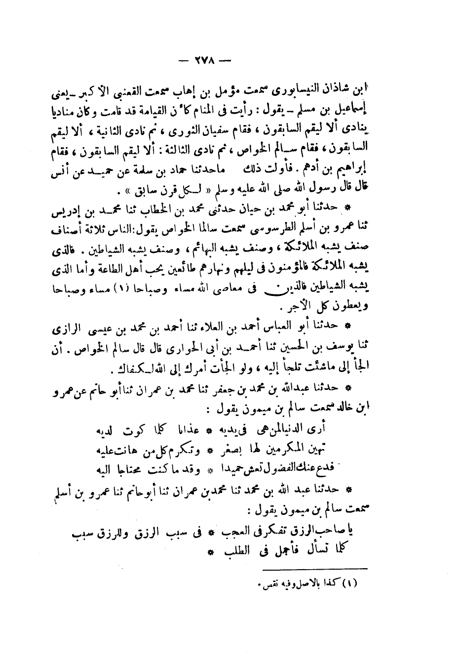 حَدَّثَنَا أَبُو مُحَمَّدِ بْنُ حَيَّانَ , حَدَّثَنِي مُحَمَّدُ بْنُ الْخَطَّابِ , ثنا مُحَمَّدُ بْنُ إِدْرِيسَ , ثنا عَمْرُو بْنُ أَسْلَمَ الطَّرَسُوسِيُّ، سَمِعْتُ سَالِمًا الْخَوَّاصَ , يَقُولُ: " §النَّاسُ ثَلَاثَةُ أَصْنَافٍ: صِنْفٌ يُشْبِهُ الْمَلَائِكَةَ وَصِنْفٌ يُشْبِهُ الْبَهَائِمَ وَصِنْفٌ يُشْبِهُ الشَّيَاطِينَ. فَالَّذِي يُشْبِهُ الْمَلَائِكَةَ فَالْمُؤْمِنُونَ فِي لَيْلِهِمْ وَنَهَارِهِمْ طَائِعُونَ، يُحِبُّ أَهْلَ الطَّاعَةِ، وَأَمَّا الَّذِينَ شِبْهُ الْبَهَائِمِ فَالَّذِينَ لَيْسَتْ لَهُمْ هِمَمٌ إِلَّا الْأَكْلَ وَالشُّرْبَ وَالنِّكَاحَ وَالنَّوْمَ فَهُمْ كَالْبَهَائِمِ وَأَمَّا الَّذِي يُشْبِهُ الشَّيَاطِينَ فَالَّذِينَ فِي مَعَاصِي اللهِ مَسَاءً وَصَبَاحًا مَسَاءً وَصَبَاحًا وَيُعْطَوْنَ كُلَّ الْأَجْرِ "