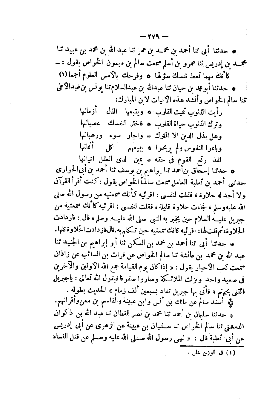 حَدَّثَنَا أَبُو مُحَمَّدِ بْنُ حَيَّانَ , ثنا عَبْدُ اللهِ بْنُ عَبْدِ السَّلَامِ , ثنا يُونُسُ بْنُ عَبْدِ الْأَعْلَى، ثنا سَالِمٌ الْخَوَّاصُ وَأَنْشَدَ هَذِهِ الْأَبْيَاتِ لِابْنِ الْمُبَارَكِ: «