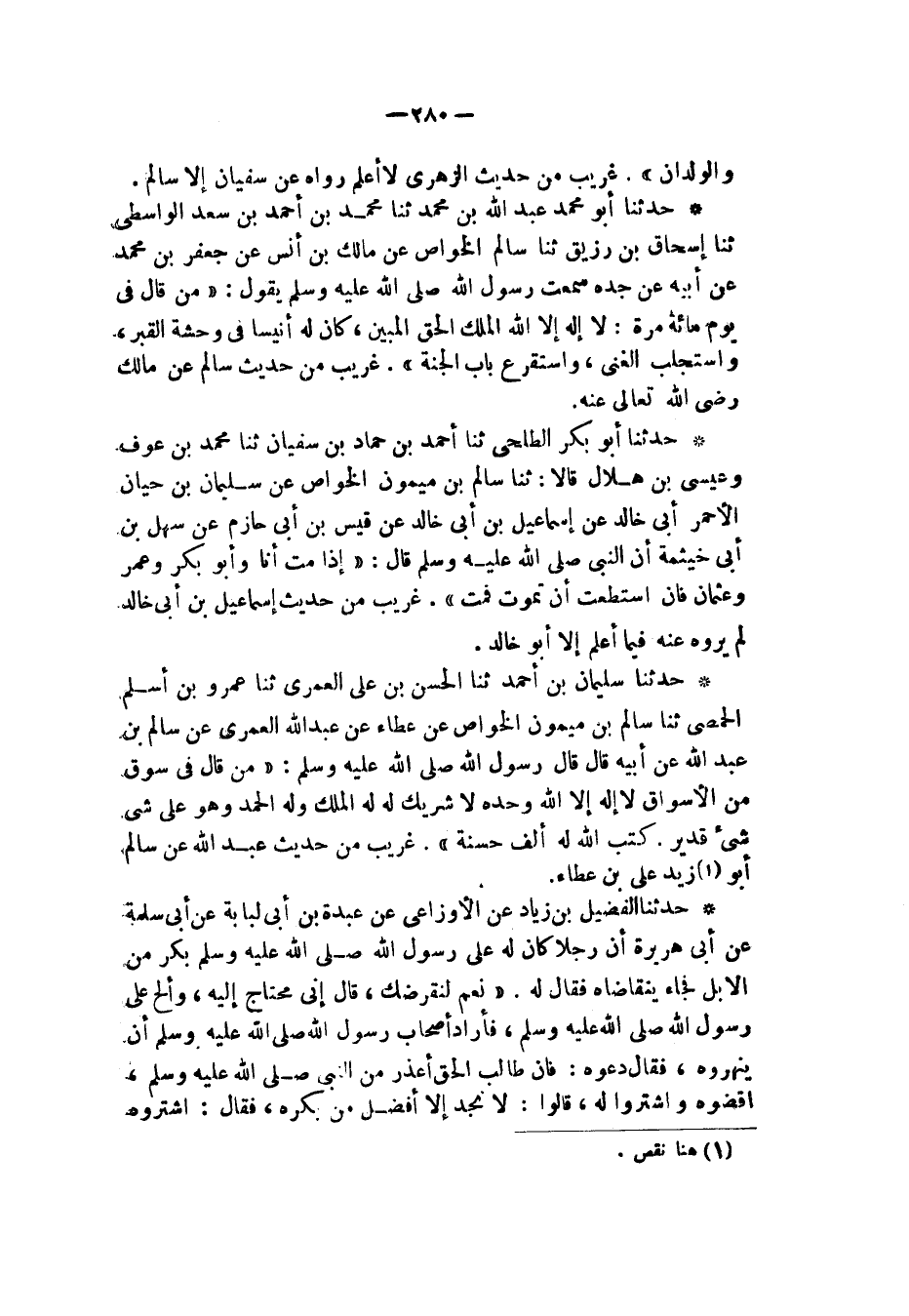 حَدَّثَنَا أَبُو مُحَمَّدٍ عَبْدُ اللهِ بْنُ مُحَمَّدٍ , ثنا مُحَمَّدُ بْنُ أَحْمَدَ بْنِ سَعْدٍ الْوَاسِطِيُّ , ثنا إِسْحَاقُ بْنُ رُزَيْقٍ، ثنا سَالِمٌ الْخَوَّاصُ , عَنْ مَالِكِ بْنِ أَنَسٍ , عَنْ جَعْفَرِ بْنِ مُحَمَّدٍ , عَنْ أَبِيهِ , عَنْ جَدِّهِ، سَمِعْتُ رَسُولَ اللهِ صَلَّى اللهُ عَلَيْهِ وَسَلَّمَ يَقُولُ: " §مَنْ قَالَ فِي يَوْمٍ مِائَةَ مَرَّةٍ: لَا إِلَهَ إِلَّا اللهُ الْمَلِكُ الْحَقُّ الْمُبِينُ كَانَ لَهُ أَنِيسًا فِي وَحْشَةِ الْقَبْرِ وَاسْتَجْلَبَ الْغِنَى وَاسْتَقْرَعَ بَابَ الْجَنَّةِ " غَرِيبٌ مِنْ حَدِيثِ سَالِمٍ عَنْ مَالِكٍ، رَضِيَ اللهُ تَعَالَى عَنْهُ