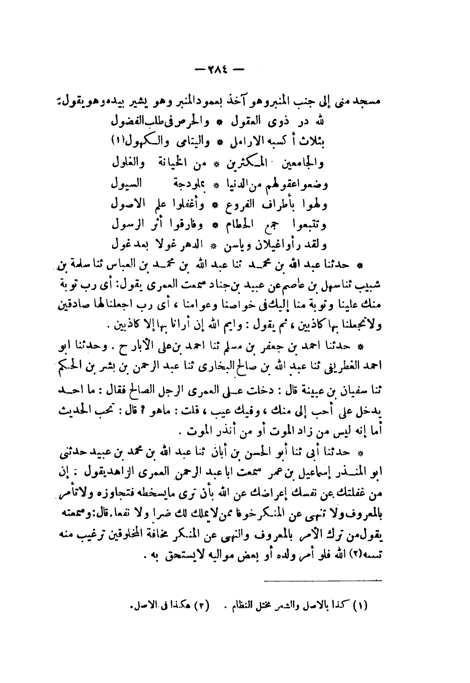 حَدَّثَنَا أَبِي , ثنا أَبُو الْحَسَنِ بْنُ أَبَانَ , ثنا عَبْدُ اللهِ بْنُ مُحَمَّدِ بْنِ عُبَيْدٍ , حَدَّثَنِي أَبُو الْمُنْذِرِ إِسْمَاعِيلُ بْنُ عُمَرَ سَمِعْتُ أَبَا عَبْدِ الرَّحْمَنِ الْعُمَرِيَّ الزَّاهِدَ , يَقُولُ: «§إِنَّ مِنَ غَفْلَتِكَ عَنْ نَفْسِكَ إِعْرَاضَكَ عَنِ اللهِ، بِأَنْ تَرَى مَا يُسْخِطُهُ فَتُجَاوِزُهُ وَلَا تَأْمُرُ بِالْمَعْرُوفِ وَلَا تَنْهَى عَنِ الْمُنْكَرِ خَوْفًا مِمَّنْ لَا يَمْلِكُ لَكَ ضَرًّا وَلَا نَفْعًا»