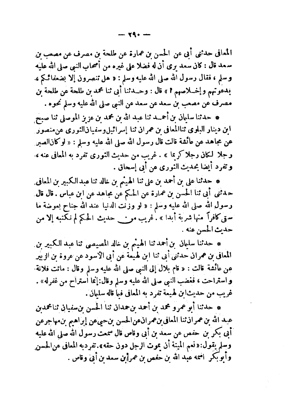 حَدَّثَنَا أَبُو عَمْرٍو مُحَمَّدُ بْنُ أَحْمَدَ بْنِ حَمْدَانَ ثنا الْحَسَنُ بْنُ سُفْيَانَ , ثنا مُحَمَّدُ بْنُ عَبْدِ اللهِ بْنِ عِمْرَانَ، ثنا الْمُعَافَى بْنُ عِمْرَانَ، عَنِ الْحَسَنِ بْنِ حُيَيٍّ , عَنْ إِبْرَاهِيمَ بْنِ مُهَاجِرٍ عَنْ أَبِي بَكْرِ بْنِ حَفْصٍ، عَنْ سَعْدِ بْنِ أَبِي وَقَّاصٍ قَالَ: سَمِعْتُ رَسُولَ اللهِ صَلَّى اللهُ عَلَيْهِ وَسَلَّمَ يَقُولُ: «§نِعْمَ الْمِيتَةُ أَنْ يَمُوتَ الرَّجُلُ دُونَ حَقِّهِ». تَفَرَّدَ بِهِ الْمُعَافَى عَنِ الْحَسَنِ. وَأَبُو بَكْرٍ اسْمُهُ عَبْدُ اللهِ بْنُ حَفْصِ بْنِ عُمَرَ بْنِ سَعْدِ بْنِ أَبِي وَقَّاصٍ