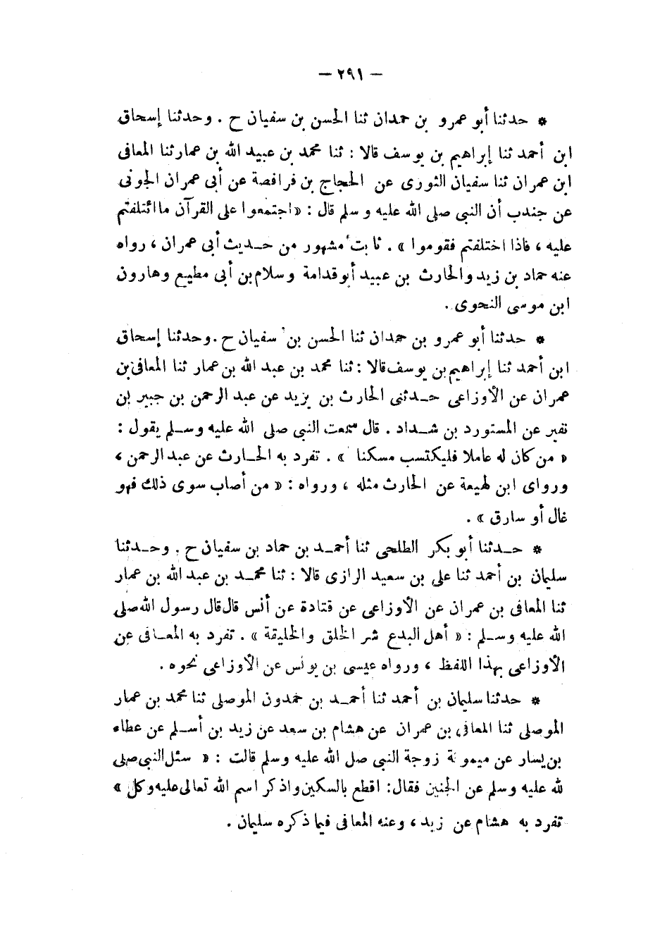 حَدَّثَنَا أَبُو عَمْرِو بْنُ حَمْدَانَ , ثنا الْحَسَنُ بْنُ سُفْيَانَ، ح وَحَدَّثَنَا إِسْحَاقُ بْنُ أَحْمَدَ , ثنا إِبْرَاهِيمُ بْنُ يُوسُفَ، قَالَا: ثنا مُحَمَّدُ بْنُ عُبَيْدِ اللهِ بْنِ عَمَّارٍ , ثنا الْمُعَافَى بْنُ عِمْرَانَ , ثنا سُفْيَانُ الثَّوْرِيُّ، عَنِ الْحَجَّاجِ بْنِ فُرَافِصَةَ , عَنْ أَبِي عِمْرَانَ الْجَوْنِيِّ، عَنْ جُنْدُبٍ , أَنَّ النَّبِيَّ صَلَّى اللهُ عَلَيْهِ وَسَلَّمَ قَالَ: «§اجْتَمَعُوا عَلَى الْقُرْآنِ مَا ائْتَلَفْتُمْ عَلَيْهِ فَإِذَا اخْتَلَفْتُمْ فَقُومُوا» ثَابِتٌ مَشْهُوَرٌ مِنْ حَدِيثِ أَبِي عِمْرَانَ رَوَاهُ عَنْهُ حَمَّادُ بْنُ زَيْدٍ وَالْحَارِثُ بْنُ عُبَيْدٍ أَبُو قُدَامَةَ , وَسَلَّامُ بْنُ أَبِي مُطِيعٍ وَهَارُونُ بْنُ مُوسَى النَّحْوِيُّ