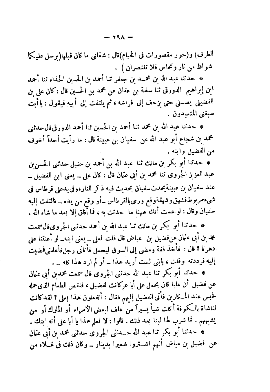 حَدَّثَنَا أَبُو بَكْرِ بْنُ مَالِكٍ ثنا عَبْدُ اللهِ بْنُ أَحْمَدَ بْنِ حَنْبَلٍ , حَدَّثَنِي الْحَسَنُ بْنُ عَبْدِ الْعَزِيزِ الْجَرَوِيُّ , ثنا مُحَمَّدُ بْنُ أَبِي عُثْمَانَ , قَالَ: كَانَ عَلِيُّ يَعْنِي ابْنَ الْفُضَيْلِ عِنْدَ سُفْيَانَ بْنِ عُيَيْنَةَ , يُحَدِّثُ سُفْيَانُ بِحَدِيثٍ فِيهِ ذِكْرُ النَّارِ وَفِي يَدِ عَلِيٌّ قِرْطَاسٌ فِي شَيْءٍ مَرْبُوطٌ فَشَهِقَ شَهْقَةً وَوَقَعَ وَرَمَى بِالْقِرْطَاسِ أوْ وَقَعَ مِنْ يَدِهِ , فَالْتَفَتَ إِلَيْهِ سُفْيَانُ , وَقَالَ: «§لَوْ عَلِمْتُ أَنَّكَ هَهُنَا مَا حُدِّثْتُ بِهِ فَمَا أَفَاقَ إِلَّا بَعْدَ مَا شَاءَ اللهُ»