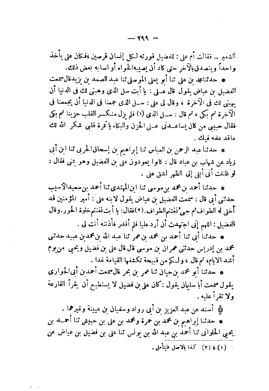 حَدَّثَنَا عَبْدُ الرَّحْمَنِ بْنُ الْعَبَّاسِ , ثنا إِبْرَاهِيمُ بْنُ إِسْحَاقَ الْحَرْبِيُّ , ثنا ابْنُ أَبِي زِيَادٍ , عَنْ شِهَابِ بْنِ عَبَّادٍ، قَالَ: كَانُوا يَعُودُونَ عَلِيَّ بْنَ الْفُضَيْلِ وَهُوَ بِمِنًى , فَقَالَ: «§لَوْ ظَنَنْتُ أَنِّي أَبْقَى إِلَى الظُّهْرِ لَشَقَّ عَلَيَّ»