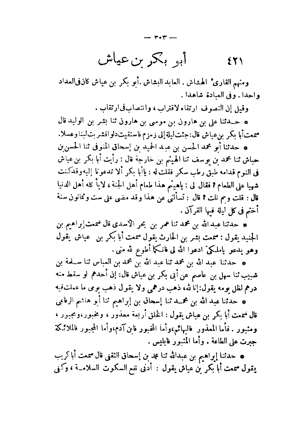 §أَبُو بَكْرِ بْنُ عَيَّاشٍ وَمِنْهُمُ الْقَارِيءُ الْهَشَّاشُ الْعَابِدُ الْبَشَّاشُ أَبُو بَكْرِ بْنُ عَيَّاشٍ كَانَ فِي الْعُدَادِ وَاحِدًا وَفِي الْعِبَادَةِ شَاهِدًا. وَقِيلَ: إِنَّ التَّصَوُّفَ ارْتِقَاءٌ لِاقْتِرَابٍ وَانْتِصَابٌ فِي ارْتِقَابٍ