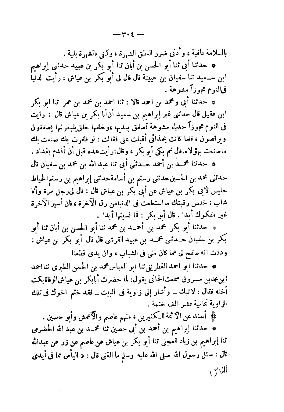 حَدَّثَنَا مُحَمَّدُ بْنُ أَحْمَدَ , حَدَّثَنِي أَبِي , ثنا عَبْدُ اللهِ بْنُ مُحَمَّدِ بْنِ سُفْيَانَ , قَالَ: حَدَّثَنِي مُحَمَّدُ بْنُ الْحُسَيْنِ , حَدَّثَنِي رُسْتُمُ بْنُ أُسَامَةَ , حَدَّثَنِي إِبْرَاهِيمُ بْنُ رُسْتُمٍ الْخَيَّاطُ , جَلِيسٌ لِأَبي بَكْرِ بْنِ عَيَّاشٍ عَنْ أَبِي بَكْرِ بْنِ عَيَّاشٍ , قَالَ: " قَالَ لِي رَجُلٌ مَرَّةً وَأَنَا شَابٌّ: " §خَلِّصْ رَقَبَتَكَ مَا اسْتَطَعْتَ فِي الدُّنْيَا مِنْ رِقِّ الْآخِرَةِ فَإِنَّ أَسِيرَ الْآخِرَةِ غَيْرُ مَفْكُوكٍ أَبَدًا قَالَ أَبُو بَكْرٍ: فَمَا نُسِّيتُهَا أَبَدًا "