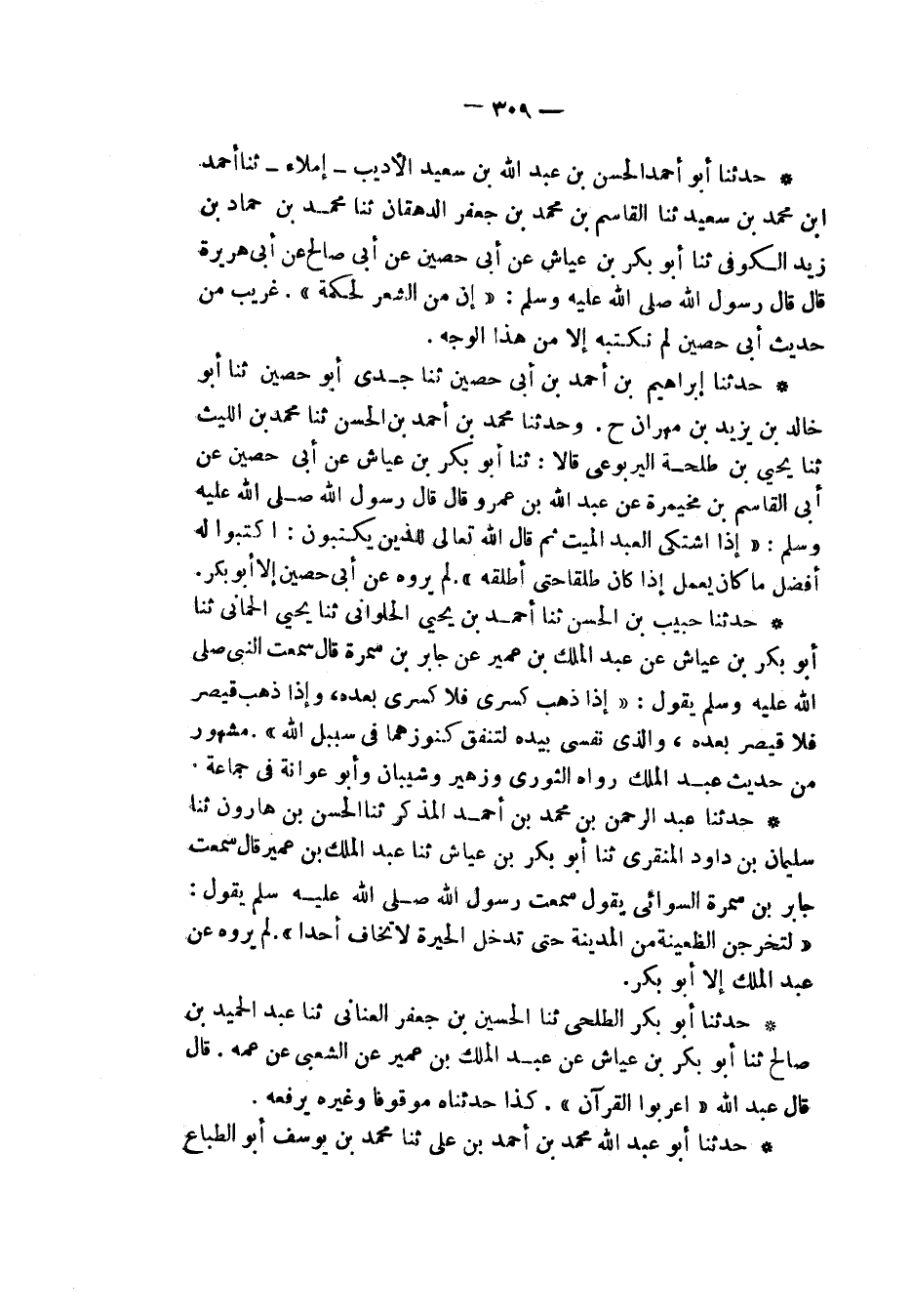 حَدَّثَنَا أَبُو بَكْرٍ الطَّلْحِيُّ , ثنا الْحُسَيْنُ بْنُ جَعْفَرٍ الْعِنَانِيُّ , ثنا عَبْدُ الْحَمِيدِ بْنُ صَالِحٍ , ثنا أَبُو بَكْرِ بْنُ عَيَّاشٍ، عَنْ عَبْدِ الْمَلِكِ بْنِ عُمَيْرٍ , عَنِ الشَّعْبِيِّ , عَنْ عَمِّهِ قَالَ عَبْدُ اللهِ: «§أَعْرِبُوا الْقُرْآنَ» كَذَا حَدَّثَنَاهُ مَوْقُوفًا وَغَيْرُهُ، يَرْفَعْهُ