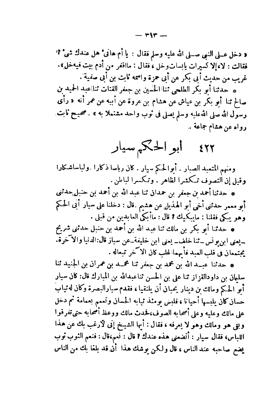 §أَبُو الْحَكَمِ سَيَّارٌ وَمِنْهُمُ الْمُتَعَبْدُ الصَّبَّارُ. أَبُو الْحَكَمِ سَيَّارٌ كَانَ رَبَّاصًا ذَكَّارًا وَلَبَّاسًا شَكَّارًا وَقِيلَ: إِنَّ التَّصَوُّفَ تَكَشُّرُ الظَّاهِرِ وَتَكَسُّرُ الْبَاطِنُ