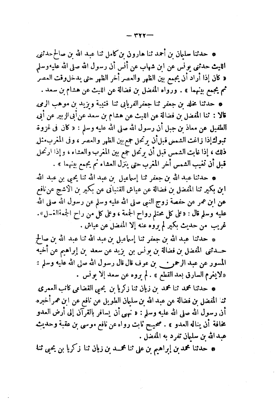 حَدَّثَنَا مُحَمَّدٌ , ثنا مُحَمَّدُ بْنُ زَيَّانَ , ثنا زَكَرِيَّا بْنُ يَحْيَى الْقُضَاعِيُّ، كَاتِبُ الْعُمَرِيِّ , ثنا الْمُفَضَّلُ بْنُ فَضَالَةَ، عَنْ عَبْدِ اللهِ بْنِ سُلَيْمَانَ الطَّوِيلِ , عَنْ نَافِعٍ، عَنِ ابْنِ عُمَرَ، أَخْبَرَهُ «أَنَّ رَسُولَ اللهِ صَلَّى اللهُ عَلَيْهِ وَسَلَّمَ §نَهَى أَنْ يُسَافَرَ بِالْقُرْآنِ إِلَى أَرْضِ الْعَدُوِّ مَخَافَةَ أَنْ يَنَالَهُ الْعَدُوُّ» صَحِيحٌ ثَابِتٌ رَوَاهُ عَنْ نَافِعٍ مُوسَى بْنُ عُقْبَةَ وَحَدِيثُ عَبْدِ اللهِ بْنِ سُلَيْمَانَ تَفَرَّدَ بِهِ الْمُفَضَّلُ