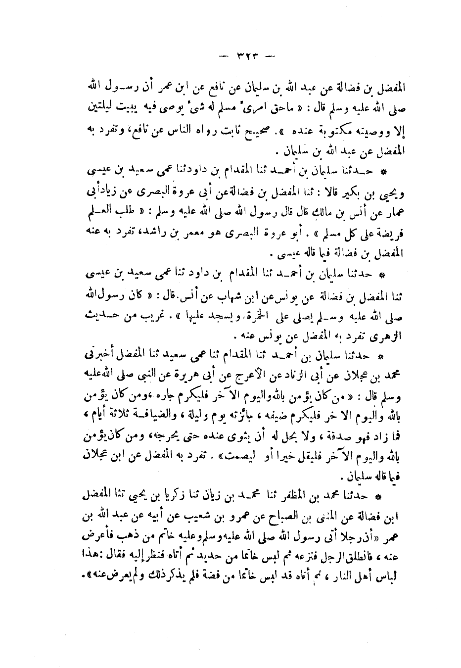حَدَّثَنَا سُلَيْمَانُ بْنُ أَحْمَدَ , ثنا الْمِقْدَامُ بْنُ دَاوُدَ , ثنا عَمِّي سَعِيدُ بْنُ عِيسَى وَيَحْيَى بْنُ بُكَيْرٍ , قَالَا: ثنا الْمُفَضَّلُ بْنُ فَضَالَةَ , عَنْ أَبِي عُرْوَةَ الْبَصْرِيِّ , عَنْ زِيَادٍ أَبِي عَمَّارٍ، عَنْ أَنَسِ بْنِ مَالِكٍ , قَالَ: قَالَ رَسُولُ اللهِ صَلَّى اللهُ عَلَيْهِ وَسَلَّمَ: «§طَلَبُ الْعِلْمِ فَرِيضَةٌ عَلَى كُلِّ مُسْلِمٍ» أَبُو عُرْوَةَ الْبَصْرِيُّ هُوَ مَعْمَرُ بْنُ رَاشِدٍ تَفَرَّدَ بِهِ عَنْهُ الْمُفَضَّلُ بْنُ فَضَالَةَ فِيمَا قَالَهُ عِيسَى