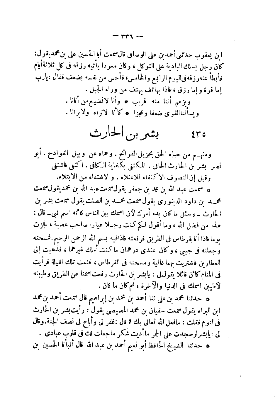 §بِشْرُ بْنُ الْحَارِثِ وَمِنْهُمْ مَنْ حَبَاهُ الْحَقُّ بِجَزِيلِ الْفَوَاتِحِ وَحَمَاهُ عَنْ وبيلِ الْفَوَادِحِ أَبُو نَصْرٍ بِشْرُ بْنُ الْحَارِثِ الْحَافِي الْمُكْتَفِي بِكِفَايَةِ الْكَافِي اكْتَفَى فَاشْتَفَى. وَقِيلَ: إِنَّ التَّصَوُّفَ الِاكْتِفَاءُ لِلِاعْتِلَاءِ وَالِاشْتِفَاءُ مِنَ الِابْتِلَاءِ