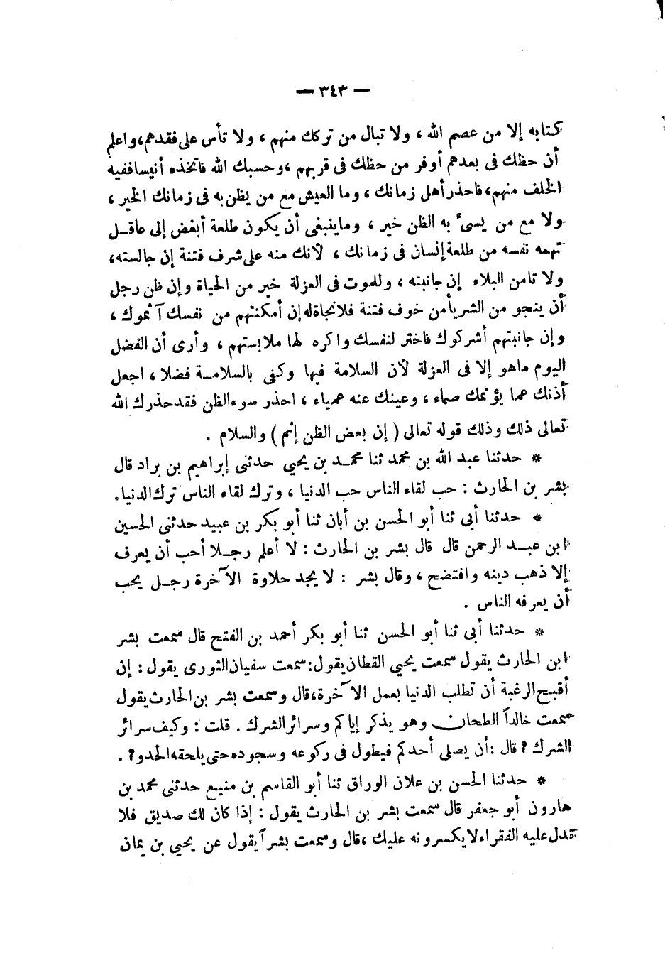 حَدَّثَنَا عَبْدُ اللهِ بْنُ مُحَمَّدٍ , ثنا مُحَمَّدُ بْنُ يَحْيَى , حَدَّثَنِي إِبْرَاهِيمُ بْنُ بَرَّادٍ , قَالَ بِشْرُ بْنُ الْحَارِثِ: «§حُبُّ لِقَاءِ النَّاسِ حُبِّ الدُّنْيَا وَتَرْكُ لِقَاءِ النَّاسِ تَرْكُ الدُّنْيَا»
