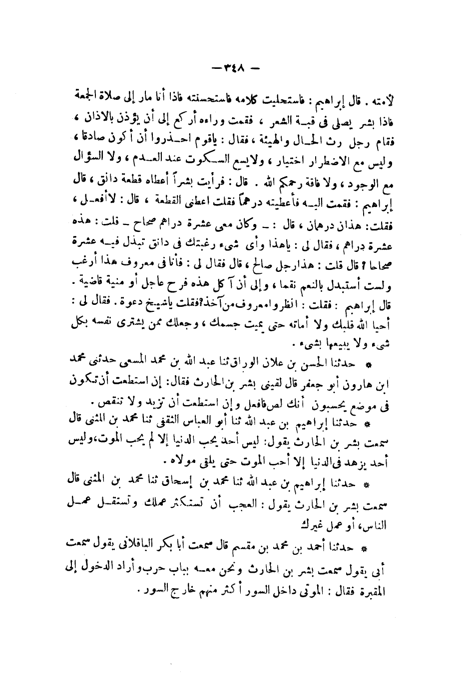 حَدَّثَنَا إِبْرَاهِيمُ بْنُ عَبْدِ اللَّهِ , ثنا أَبُو الْعَبَّاسِ الثَّقَفِيُّ , ثنا مُحَمَّدُ بْنُ الْمُثَنَّى , قَالَ: سَمِعْتُ بِشْرَ بْنَ الْحَارِثِ , يَقُولُ: «§لَيْسَ أَحَدٌ يُحِبُّ الدُّنْيَا إِلَّا لَمْ يُحِبَّ الْمَوْتَ وَلَيْسَ أَحَدٌ يَزْهَدُ فِي الدُّنْيَا إِلَّا أَحَبَّ الْمَوْتَ حَتَّى يَلْقَى مَوْلَاهُ»