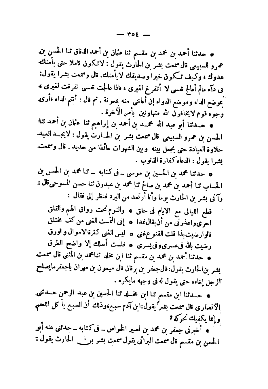 حَدَّثَنَا مُحَمَّدُ بْنُ الْحُسَيْنِ بْنِ مُوسَى , فِي كِتَابِهِ , ثنا مُحَمَّدُ بْنُ الْحَسَنِ بْنِ الْخَشَّابِ , ثنا أَحْمَدُ بْنُ مُحَمَّدِ بْنِ صَالِحٍ , ثنا مُحَمَّدُ بْنُ عَبْدُونٍ , ثنا حَسَنُ الْمَسُوحِيُّ , قَالَ: رَآنِي بِشْرُ بْنُ الْحَارِثِ يَوْمًا وَأَنَا أَرْتَعِدُ، مِنَ الْبَرْدِ فَنَظَرَ إِلَيَّ فَقَالَ: