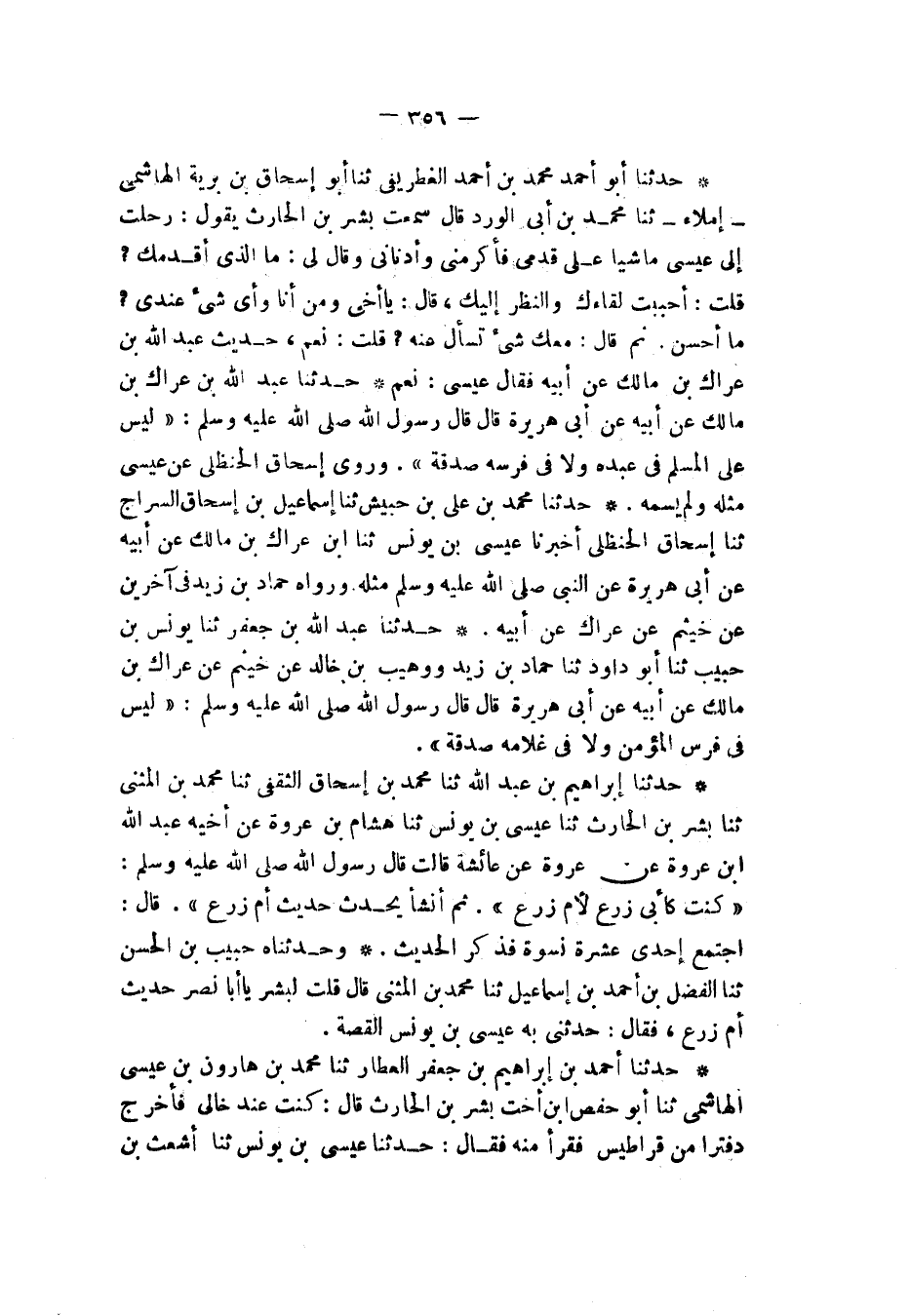 حَدَّثَنَا أَبُو أَحْمَدَ مُحَمَّدُ بْنُ أَحْمَدَ الْغِطْرِيفِيُّ , ثنا أَبُو إِسْحَاقَ بْنُ بَرِيَّةَ الْهَاشِمِيُّ، إِمْلَاءً , ثنا مُحَمَّدُ بْنُ أَبِي الْوَرْدِ، قَالَ: سَمِعْتُ بِشْرَ بْنَ الْحَارِثِ , يَقُولُ: رَحَلْتُ إِلَى عِيسَى مَاشِيًا عَلَى قَدَمَيَّ فَأَكْرَمَنِي وَأَدْنَانِي , وَقَالَ لِي: مَا الَّذِي أَقْدَمَكَ؟ قُلْتُ: أَحْبَبْتُ لِقَاءَكَ وَالنَّظَرَ إِلَيْكَ , قَالَ: يَا أَخِي وَمَنْ أَنَا , وَأَيُّ شَيْءٍ عِنْدِي مَا أَحْسَنَ. ثُمَّ قَالَ: مَعَكَ شَيْءٌ تَسْأَلُ عَنْهُ؟ قُلْتُ: نَعَمْ حَدِيثُ عَبْدِ اللَّهِ بْنِ عِرَاكِ بْنِ مَالِكٍ عَنْ أَبِيهِ، فَقَالَ عِيسَى: نَعَمْ " حَدَّثَنَا عَبْدُ اللَّهِ بْنُ عِرَاكِ بْنِ مَالِكٍ , عَنْ أَبِيهِ، عَنْ أَبِي هُرَيْرَةَ , قَالَ: قَالَ رَسُولُ اللَّهِ صَلَّى اللهُ عَلَيْهِ وَسَلَّمَ: «§لَيْسَ عَلَى الْمُسْلِمِ فِي عَبْدِهِ وَلَا فِي فَرَسِهِ صَدَقَةٌ» وَرَوَى إِسْحَاقُ الْحَنْظَلِيُّ عَنْ عِيسَى مِثْلَهُ وَلَمْ يُسَمِّهِ