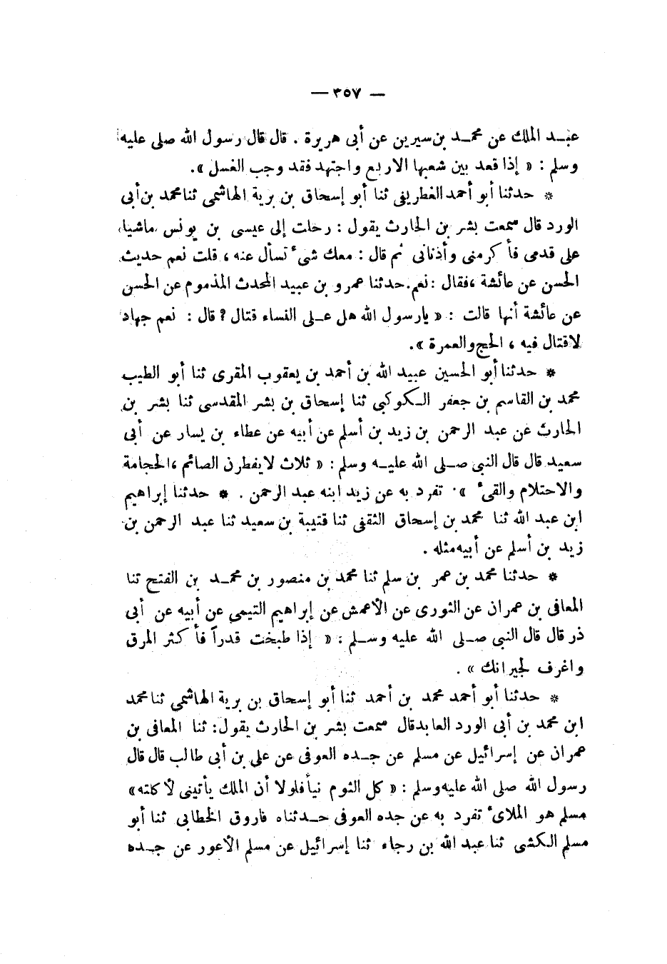 حَدَّثَنَا أَبُو أَحْمَدَ الْغِطْرِيفِيُّ , ثنا أَبُو إِسْحَاقَ بْنُ بَرِيَّةَ الْهَاشِمِيُّ , ثنا مُحَمَّدُ بْنُ أَبِي الْوَرْدِ، قَالَ: سَمِعْتُ بِشْرَ بْنَ الْحَارِثِ , يَقُولُ: رَحَلْتُ إِلَى عِيسَى بْنَ يُونُسَ مَاشِيًا عَلَى قَدَمَيَّ فَأَكْرَمَنِي وَأَدْنَانِي , ثُمَّ قَالَ: مَعَكَ شَيْءٌ تَسْأَلُ عَنْهُ قُلْتُ: نَعَمْ حَدِيثُ الْحَسَنِ عَنْ عَائِشَةَ , فَقَالَ: نَعَمْ حَدَّثَنَا عَمْرُو بْنُ عُبَيْدٍ الْمُحَدِّثُ الْمَذْمُومُ , عَنِ الْحَسَنِ، عَنْ عَائِشَةَ , أَنَّهَا قَالَتْ: يَا رَسُولَ اللَّهِ §هَلْ عَلَى النِّسَاءِ قِتَالٌ؟ قَالَ: «نَعَمْ جِهَادٌ لَا قِتَالَ فِيهِ الْحَجُّ وَالْعُمْرَةُ»