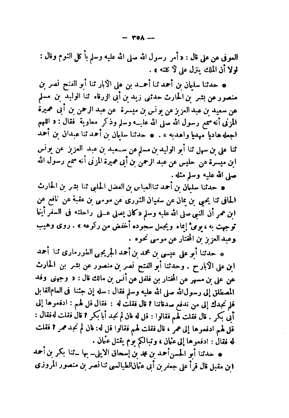 حَدَّثَنَا أَبُو الْحَسَنِ أَحْمَدُ بْنُ مُحَمَّدِ بْنِ إِسْحَاقَ الْأَيْلِيُّ بِهَا , ثنا بَكْرُ بْنُ أَحْمَدَ بْنِ مُقْبِلٍ , قَالَ: قَرَأَ عَلِيُّ بْنُ جَعْفَرِ بْنِ أَبِي عُثْمَانَ الطَّيَالِسِيُّ , ثنا نَصْرُ بْنُ مَنْصُورٍ الْمَرْوَزِيُّ , -[359]- ثنا بِشْرُ بْنُ الْحَارِثِ , ثنا عِيسَى بْنُ مُحَمَّدٍ الْجُرَيْجِيُّ , ثنا الْحَسَنُ بْنُ عَلِيٍّ الْعُمَرِيُّ , ح. وَحَدَّثَنَا مَخْلَدُ بْنُ جَعْفَرٍ , ثنا أَبُو الْعَبَّاسِ الْبَرَاثِيُّ , قَالَا: ثنا نُعَيْمُ بْنُ الْهَيْصَمِ , أَخْبَرَنِي بِشْرُ بْنُ الْحَارِثِ , عَنْ عَبْدِ اللَّهِ بْنِ دَاوُدَ الْخَرِيبِيِّ، عَنْ سُوَيْدٍ، مَوْلَى عَمْرِو بْنِ حُرَيْثٍ , قَالَ: سَمِعْتُ عَلِيَّ بْنَ أَبِي طَالِبٍ، يَقُولُ عَلَى الْمِنْبَرِ: «إِنَّ §أَفْضَلَ النَّاسِ بَعْدَ رَسُولِ اللَّهِ صَلَّى اللهُ عَلَيْهِ وَسَلَّمَ أَبُو بَكْرٍ وَعُمَرَ وَعُثْمَانَ رَضِيَ اللَّهُ تَعَالَى عَنْهُمْ»