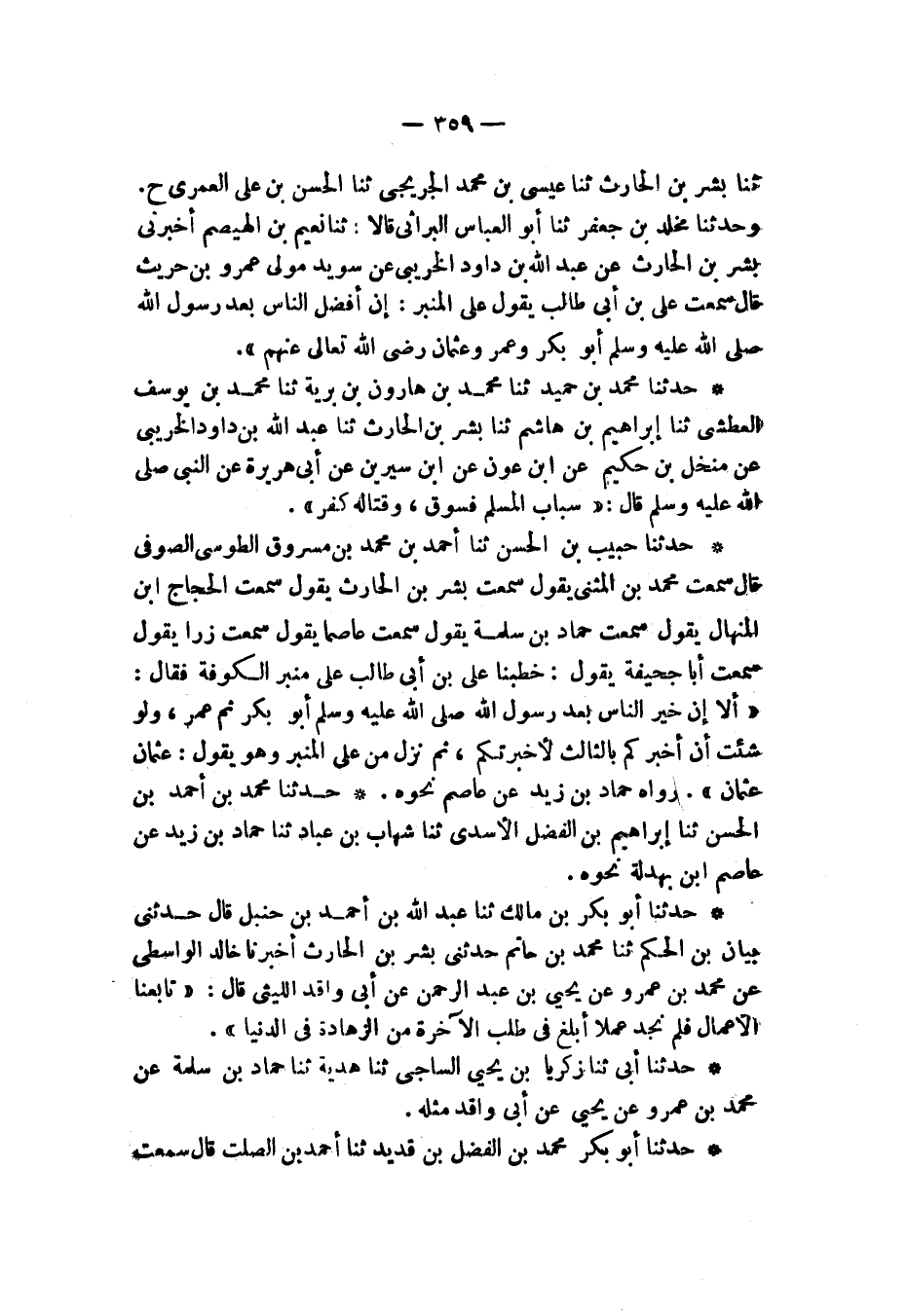 حَدَّثَنَا حَبِيبُ بْنُ الْحَسَنِ , ثنا أَحْمَدُ بْنُ مُحَمَّدِ بْنِ مَسْرُوقٍ الطُّوسِيُّ الصُّوفِيُّ , قَالَ: سَمِعْتُ مُحَمَّدَ بْنَ الْمُثَنَّى , يَقُولُ: سَمِعْتُ بِشْرَ بْنَ الْحَارِثِ , يَقُولُ: سَمِعْتُ الْحَجَّاجَ بْنَ الْمِنْهَالِ , يَقُولُ: سَمِعْتُ حَمَّادَ بْنَ سَلَمَةَ , يَقُولُ: سَمِعْتُ عَاصِمًا , يَقُولُ: سَمِعْتُ زِرًّا , يَقُولُ: سَمِعْتُ أَبَا جُحَيْفَةَ , يَقُولُ: خَطَبَنَا عَلِيُّ بْنُ أَبِي طَالِبٍ عَلَى مِنْبَرِ الْكُوفَةِ , فَقَالَ: " أَلَا إِنَّ §خَيْرَ النَّاسِ بَعْدَ رَسُولِ اللَّهِ صَلَّى اللهُ عَلَيْهِ وَسَلَّمَ أَبُو بَكْرٍ ثُمَّ عُمَرُ وَلَوْ شِئْتَ أَنْ أُخْبِرَكُمْ بِالثَّالِثِ، لَأَخْبَرْتُكُمْ ثُمَّ نَزَلَ مِنْ عَلَى الْمِنْبَرِ وَهُوَ يَقُولُ: عُثْمَانُ عُثْمَانُ " رَوَاهُ حَمَّادُ بْنُ زَيْدٍ عَنْ عَاصِمٍ، نَحْوَهُ حَدَّثَنَا مُحَمَّدُ بْنُ أَحْمَدَ بْنِ الْحَسَنِ , ثنا إِبْرَاهِيمُ بْنُ الْفَضْلِ الْأَسَدِيُّ , ثنا شِهَابُ بْنُ عَبَّادٍ , ثنا حَمَّادُ بْنُ زَيْدٍ , عَنْ عَاصِمِ ابْنِ بَهْدَلَةَ , نَحْوَهُ