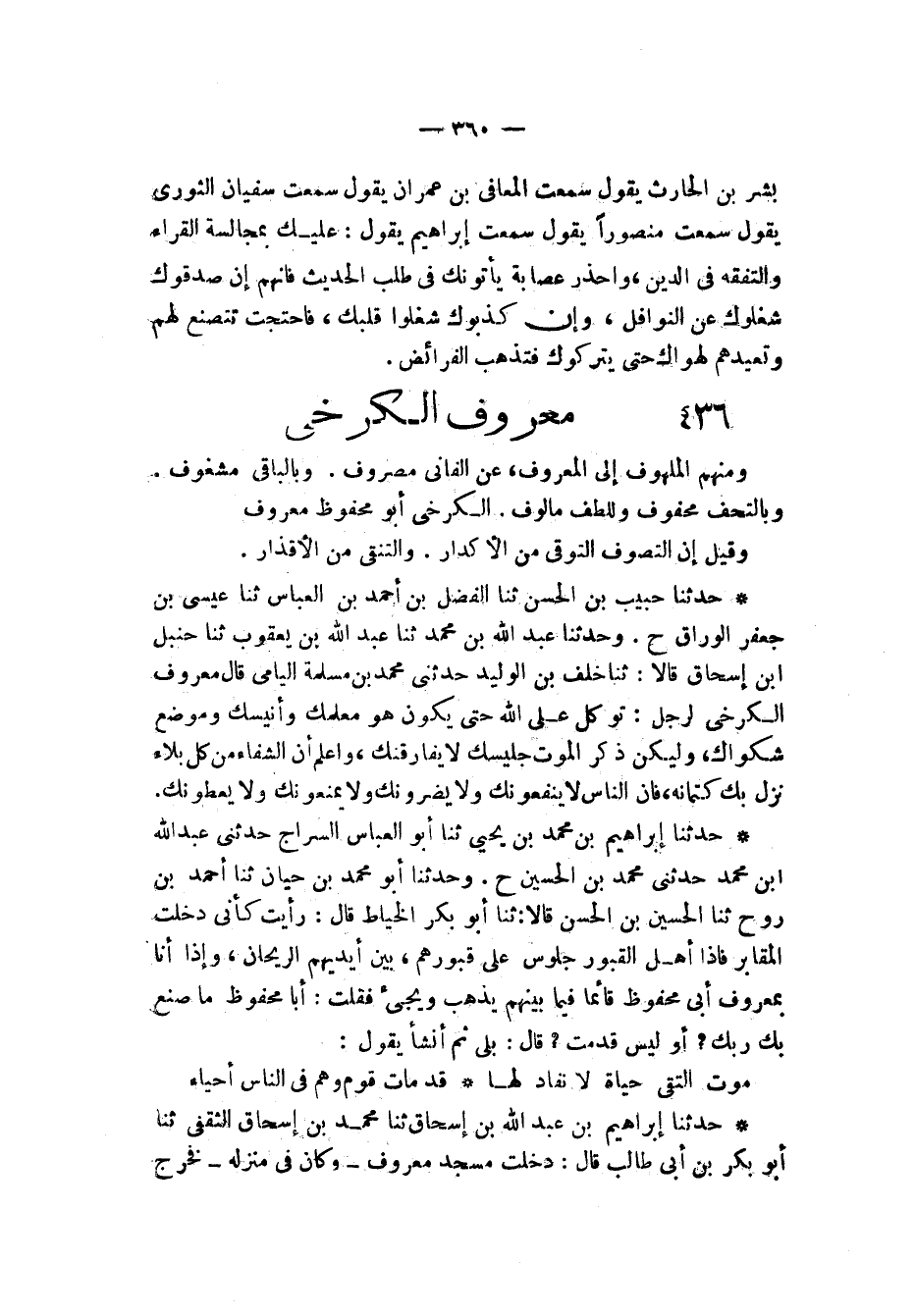 حَدَّثَنَا إِبْرَاهِيمُ بْنُ عَبْدِ اللَّهِ بْنِ إِسْحَاقَ , ثنا مُحَمَّدُ بْنُ إِسْحَاقَ الثَّقَفِيُّ , ثنا أَبُو بَكْرِ بْنُ أَبِي طَالِبٍ , قَالَ: دَخَلْتُ مَسْجِدَ مَعْرُوفٍ وَكَانَ فِي مَنْزِلِهِ فَخَرَجَ -[361]- إِلَيْنَا وَنَحْنُ جَمَاعَةٌ فَقَالَ: " السَّلَامُ عَلَيْكُمْ وَرَحْمَةُ اللَّهِ فَرَدَدْنَا عَلَيْهِ السَّلَامُ فَقَالَ: حَيَّاكُمُ اللَّهُ بِالسَّلَامِ §وَنَعَّمَنَا وَإِيَّاكُمْ فِي الدُّنْيَا بِالْأَحْزَانِ ثُمَّ أَذِنَ فَلَمَّا أَخَذَ فِي الْأَذَانِ اضْطَرَبَ وَارْتَعَدَ حِينَ قَالَ: أَشْهَدُ أَنْ لَا إِلَهَ إِلَّا اللَّهُ فَقَامَ شَعَرُ حَاجِبَيْهِ وَلِحْيَتِهِ حَتَّى خِفْتُ أَنْ لَا يُتِمَّ أَذَانُهُ وَانْحَنَى حَتَّى كَادَ أَنْ يَسْقُطَ "