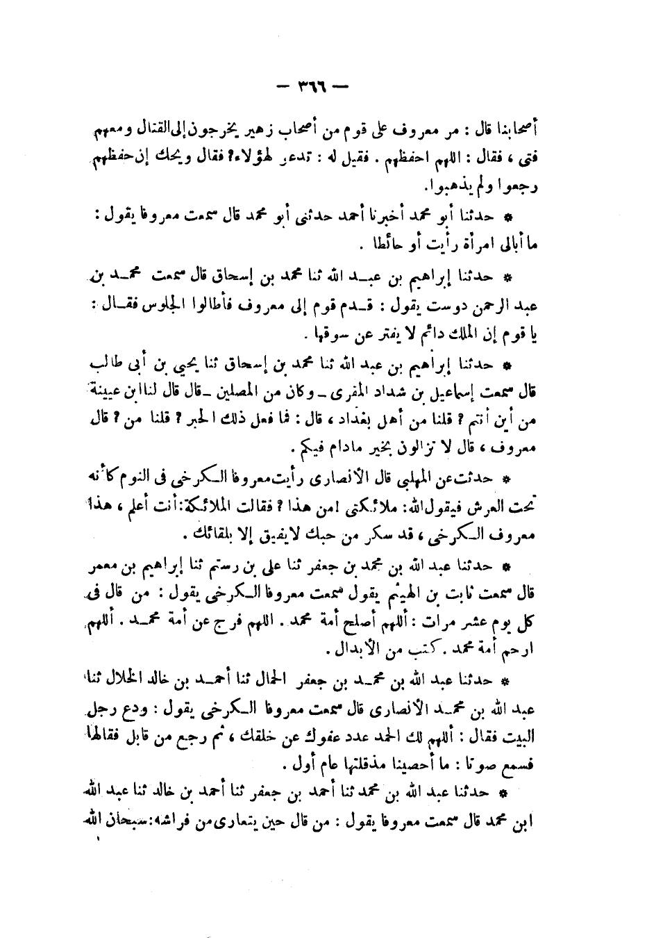 حَدَّثَنَا عَبْدُ اللَّهِ بْنُ مُحَمَّدٍ , ثنا أَحْمَدُ بْنُ جَعْفَرٍ , ثنا أَحْمَدُ بْنُ خَالِدٍ , ثنا عَبْدُ اللَّهِ بْنُ مُحَمَّدٍ، قَالَ: سَمِعْتُ مَعْرُوفًا , يَقُولُ: " مَنْ قَالَ حِينَ يَتَعارَى مِنْ فِرَاشِهِ: §سُبْحَانَ اللَّهِ , -[367]- وَالْحَمْدُ لِلَّهِ , وَلَا إِلَهَ إِلَّا اللَّهُ , وَأَسْتَغْفِرُ اللَّهَ , اللَّهُمَّ إِنَّي أَسْأَلُكَ مِنْ فَضْلِكَ وَرَحْمَتِكَ؛ فَإِنَّهُمَا بِيَدِكَ لَا يَمْلُكُهُمَا أَحَدٌ سِوَاكَ , إِلَّا قَالَ اللَّهُ لِجِبْرِيلَ وَهُوَ مَلَكٌ مُوَكَّلٌ بِقَضَاءِ حَوَائِجِ الْعِبَادِ: يَا جِبْرِيلُ اقْضِ حَاجَةَ عَبْدِي "