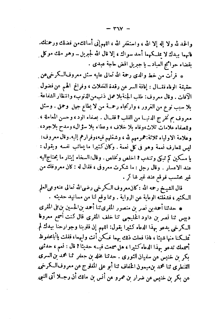 وَقَالَ رَجُلٌ: مَا شَكَرْتُ مَعْرُوفِي , فَقَالَ لَهُ: «كَانَ §مَعْرُوفُكَ مِنْ غَيْرِ مُحْتَسِبٍ فَوَقَعَ عِنْدَ غَيْرِ شَاكِرٍ» قَالَ الشَّيْخُ رَحِمَهُ اللَّهُ: كَانَ مَعْرُوفٌ الْكَرْخِيُّ رَضِيَ اللَّهُ تَعَالَى عَنْهُ وَعَى الْعِلْمَ الْكَثِيرَ فَشَغَلَتْهُ الْوِعَايَةُ عَنِ الرِّوَايَةِ. وَمِمَّا وَقَعَ لَنَا مِنْ مَسَانِيدِ حَدِيثِهِ