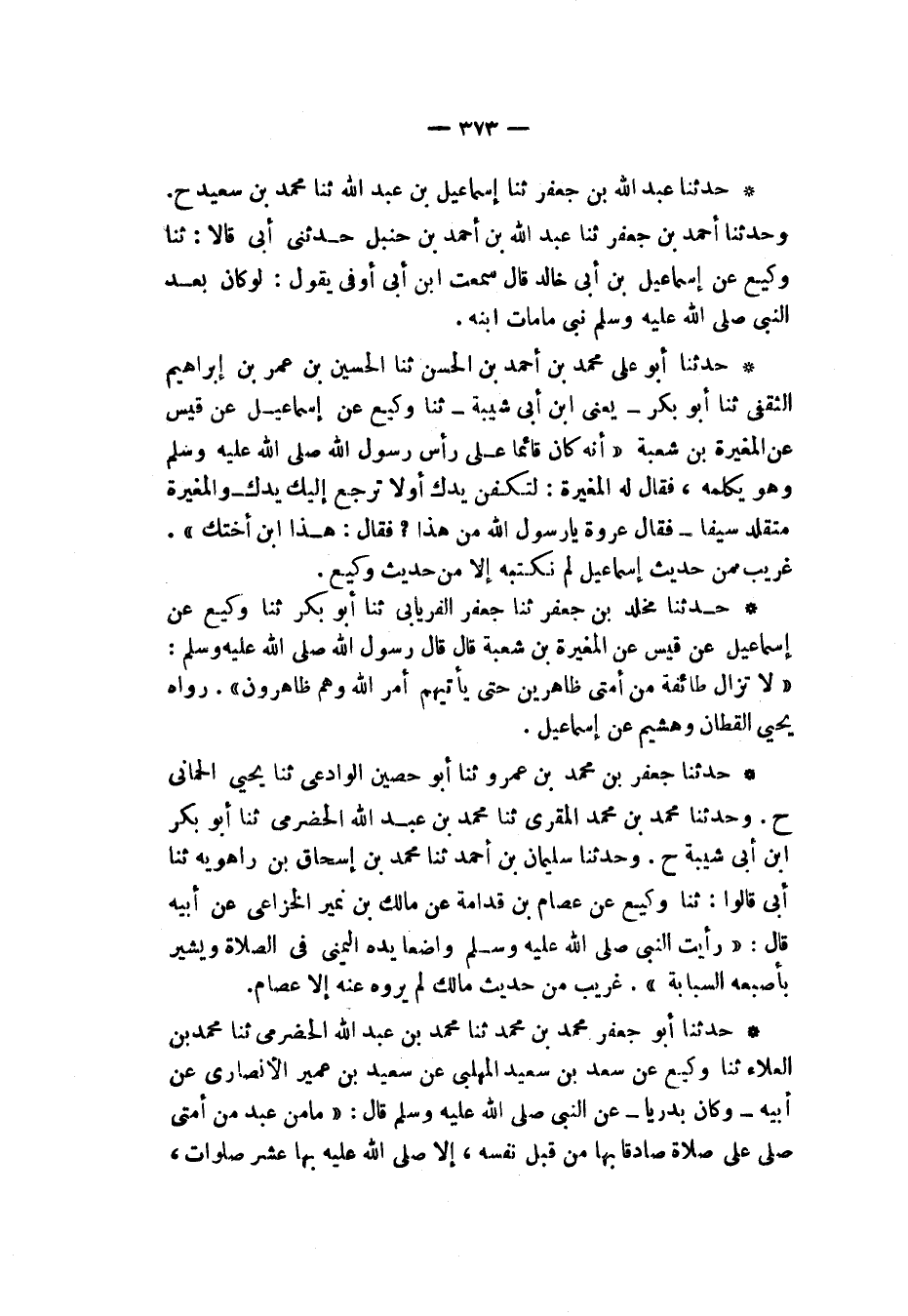 حَدَّثَنَا أَبُو جَعْفَرٍ مُحَمَّدُ بْنُ مُحَمَّدٍ ثنا مُحَمَّدُ بْنُ عَبْدِ اللَّهِ الْحَضْرَمِيُّ , ثنا مُحَمَّدُ بْنُ الْعَلَاءِ , ثنا وَكِيعٌ , عَنْ سَعْدِ بْنِ سَعِيدٍ التَّغْلِبِيِّ , عَنْ سَعِيدِ بْنِ عُمَيْرٍ الْأَنْصَارِيِّ، عَنْ أَبِيهِ، وَكَانَ، بَدْرِيًّا عَنِ النَّبِيِّ صَلَّى اللهُ عَلَيْهِ وَسَلَّمَ قَالَ: «§مَا مِنْ عَبْدٍ مِنْ أُمَّتِي صَلَّى عَلَيَّ صَلَاةً صَادِقًا بِهَا مِنْ قِبَلِ نَفْسِهِ إِلَّا صَلَّى اللَّهُ عَلَيْهِ بِهَا عَشْرَ صَلَوَاتٍ , -[374]- وَكَتَبَ لَهُ بِهَا عَشْرَ حَسَنَاتٍ وَمُحِيَ عَنْهُ بِهَا عَشْرُ سَيِّئَاتٍ» لَا أَعْلَمُ أَحَدًا رَوَاهُ بِهَذَا اللَّفْظِ إِلَّا سَعْدٌ عَنْ سَعِيدٍ