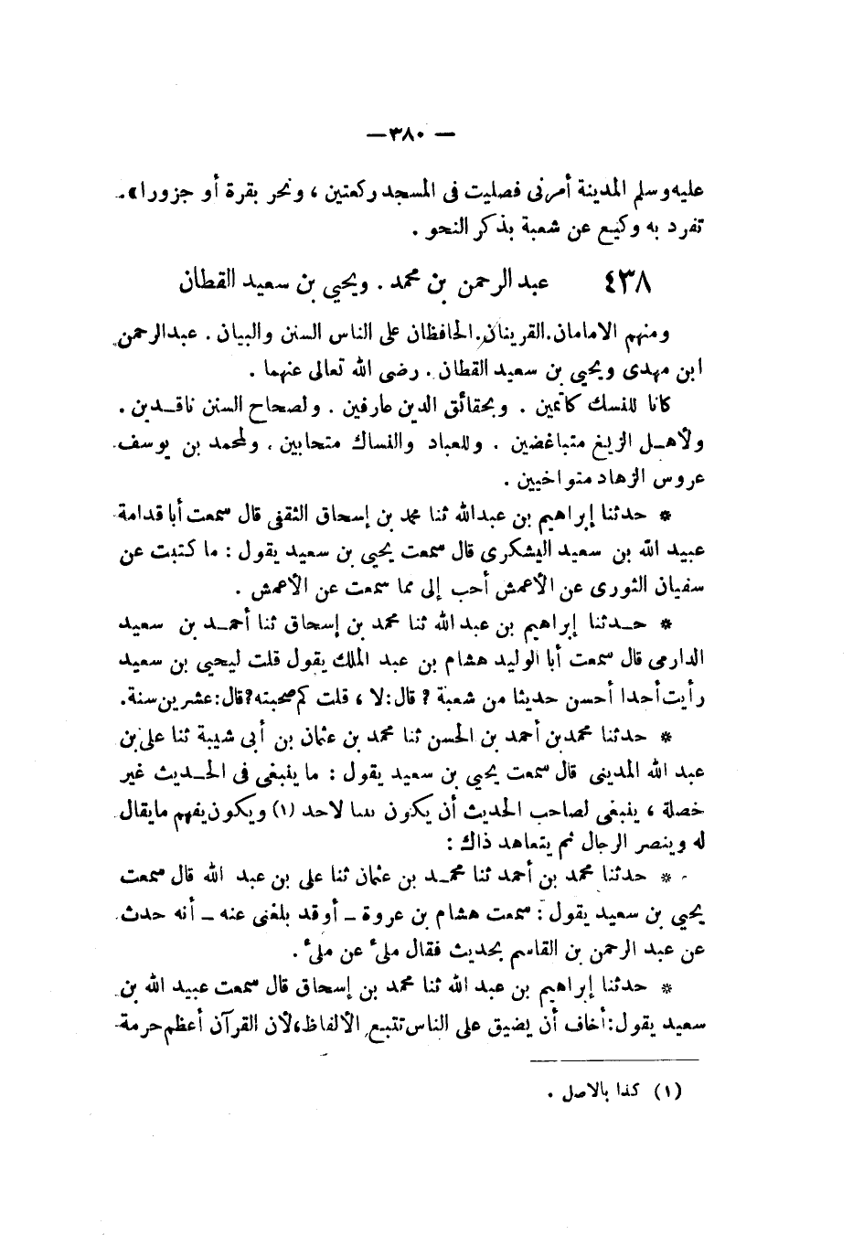 حَدَّثَنَا إِبْرَاهِيمُ بْنُ عَبْدِ اللَّهِ , ثنا مُحَمَّدُ بْنُ إِسْحَاقَ الثَّقَفِيُّ , قَالَ: سَمِعْتُ أَبَا قُدَامَةَ عُبَيْدَ اللَّهِ بْنَ سَعِيدٍ الْيَشْكُرِيَّ قَالَ: سَمِعْتُ يَحْيَى بْنَ سَعِيدٍ , يَقُولُ: «مَا كَتَبْتُ عَنْ سُفْيَانَ الثَّوْرِيِّ، عَنِ الْأَعْمَشِ §أَحَبُّ إِلَيَّ مِمَّا سَمِعْتُ عَنَ الْأَعْمَشَ»