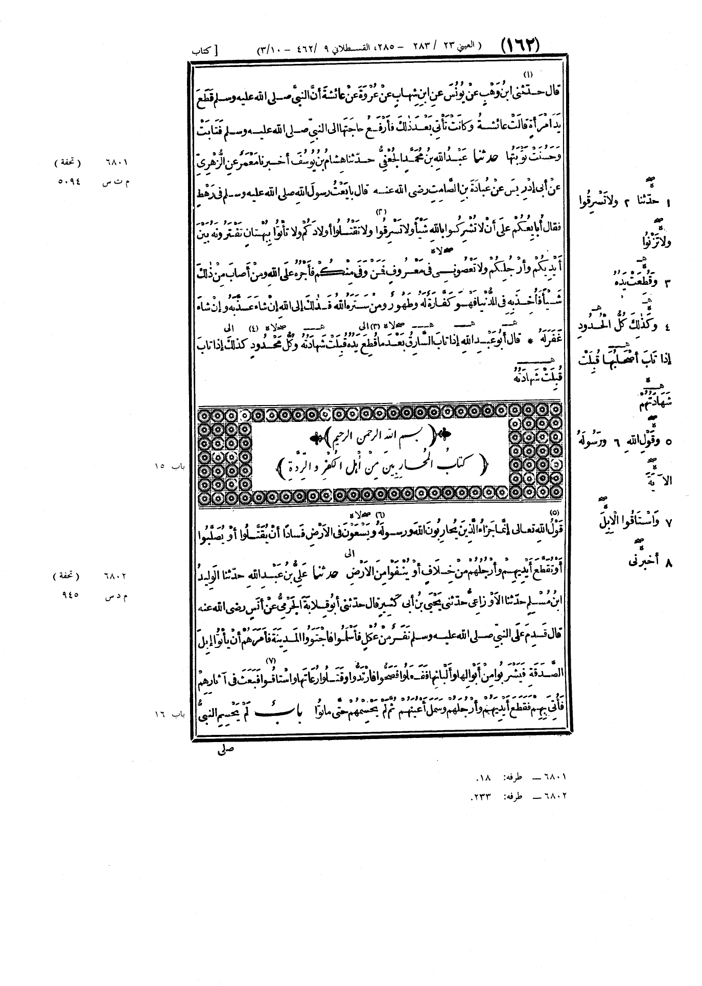 بَابُ «لَمْ يَحْسِمِ النَّبِيُّ صَلَّى اللهُ عَلَيْهِ وَسَلَّمَ ⦗١٦٣⦘ المُحَارِبِينَ مِنْ أَهْلِ الرِّدَّةِ حَتَّى هَلَكُوا»