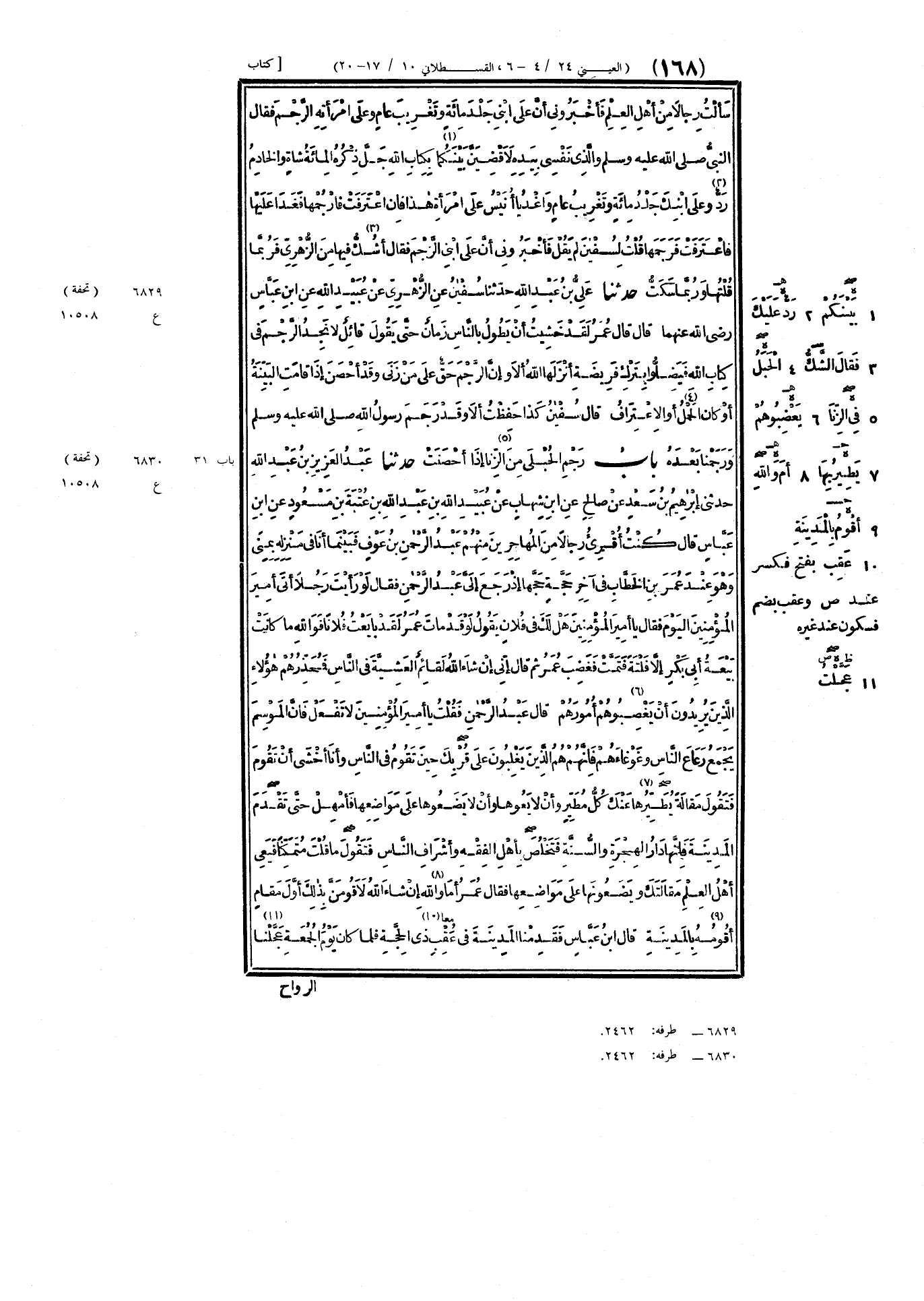 (اقضوا أمركم) افصلوا في أمركم واختياركم لخليفتكم. (مزمل) ملتف في ثوب. (يوعك) تصيبه الحمى. (تشهد) قال كلمة الشهادة. (خطيبهم) قيل كان ثابت بن قيس بن شماس. (كتيبة الإسلام) الكتيبة هي الجيش المجتمع الذي لا ينتشر والمراد أنهم أكثر المسلمين ومجتمع الإسلام. (رهط) نفر يسير بمنزلة الرهط وهو ما دون العشرة من الرجال. (دفت دافة) جاء عدد قليل والدافة الرفقة يسيرون سيرا لينا والمعنى إنكم قوم غرباء مطرودون أقبلتم من مكة إلينا. (أن يختزلونا) أن يقتطعونا عن الأمر وينفردوا به دوننا. (يحضنونا) يخرجونا من الإمارة والحكم ويستأثروا به علينا. (زورت) من التزوير وهو التحسين والتزيين. (أداري منه بعض الحد) أدفع عنه بعض ما يعتريه من الغضب ونحوه. (على رسلك) اتئد واستعمل الرفق. (أوقر) أكثر وقارا وهو الرزانة عند الطلب والتأني في الأمور. (بديهته) هي سداد الرأي عند المفاجأة والمعرفة يجدها الإنسان في نفسه من غير إعمال للفكر ولا علم بأسبابها. (يعرف هذا الأمر) الخلافة. (غيرها) أي ما كرهت إلا قوله وإشارته إلي. (تسول) تزين