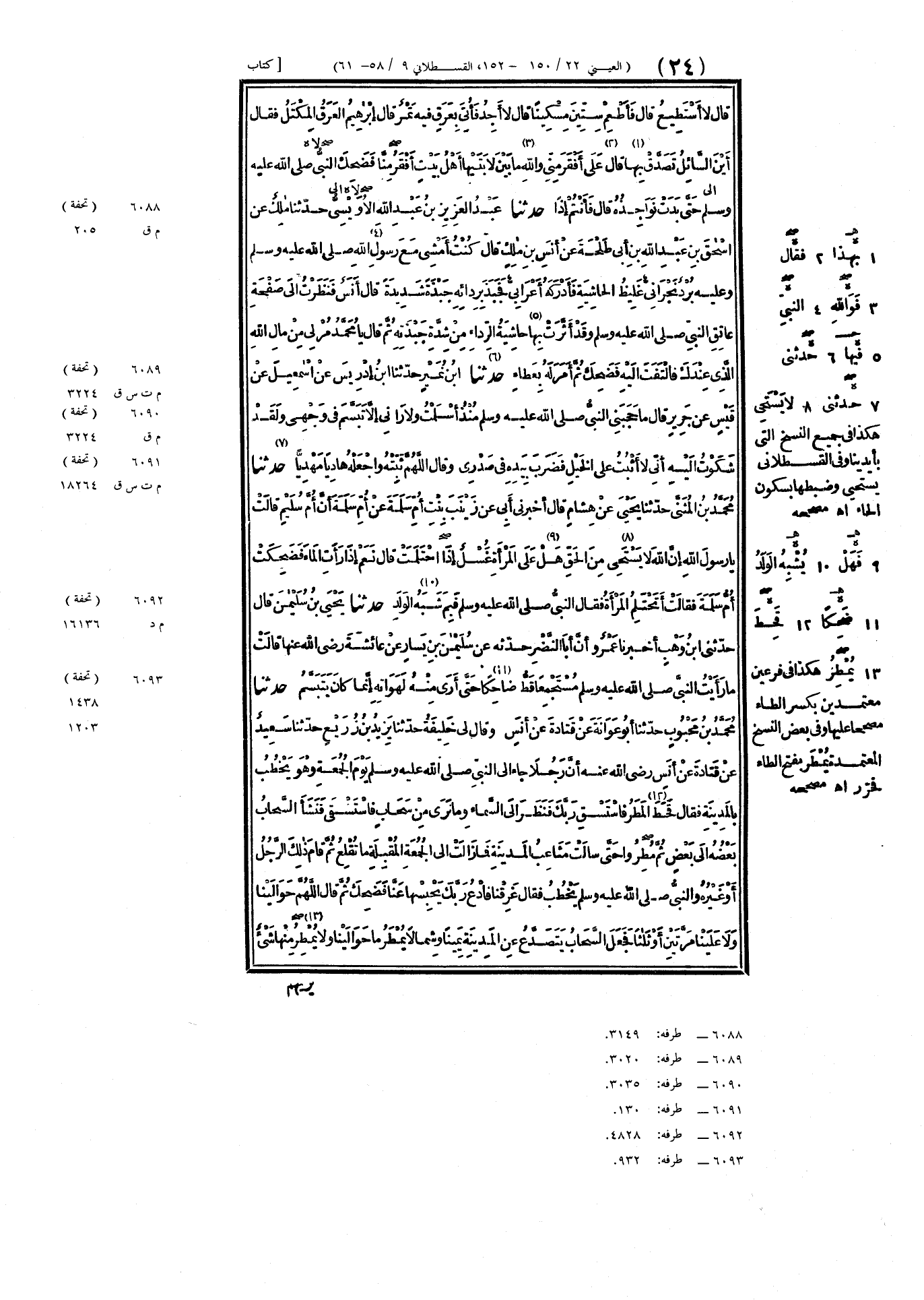 ٦٠٨٨ - حَدَّثَنَا عَبْدُ العَزِيزِ بْنُ عَبْدِ اللَّهِ الأُوَيْسِيُّ، حَدَّثَنَا مَالِكٌ، عَنْ إِسْحَاقَ بْنِ عَبْدِ اللَّهِ بْنِ أَبِي طَلْحَةَ، عَنْ أَنَسِ بْنِ مَالِكٍ، قَالَ: «كُنْتُ أَمْشِي مَعَ رَسُولِ اللَّهِ صَلَّى اللهُ عَلَيْهِ وَسَلَّمَ وَعَلَيْهِ بُرْدٌ نَجْرَانِيٌّ غَلِيظُ الحَاشِيَةِ»، فَأَدْرَكَهُ أَعْرَابِيٌّ فَجَبَذَ بِرِدَائِهِ جَبْذَةً شَدِيدَةً، قَالَ أَنَسٌ: «فَنَظَرْتُ إِلَى صَفْحَةِ عَاتِقِ النَّبِيِّ صَلَّى اللهُ عَلَيْهِ وَسَلَّمَ، وَقَدْ أَثَّرَتْ بِهَا حَاشِيَةُ الرِّدَاءِ مِنْ شِدَّةِ جَبْذَتِهِ»، ثُمَّ قَالَ: يَا مُحَمَّدُ مُرْ لِي مِنْ مَالِ اللَّهِ الَّذِي عِنْدَكَ، «فَالْتَفَتَ إِلَيْهِ فَضَحِكَ ثُمَّ أَمَرَ لَهُ بِعَطَاءٍ»