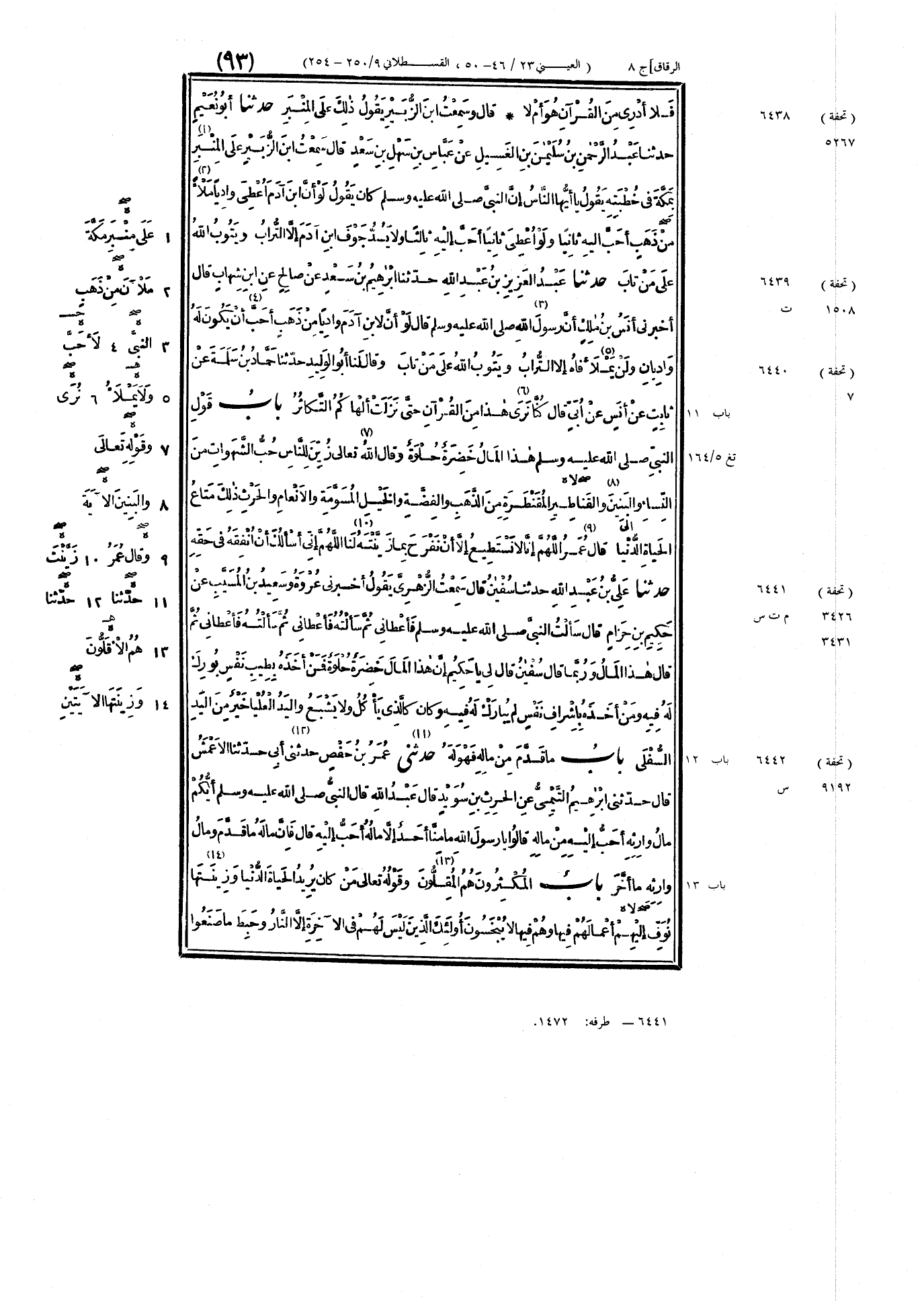 ٦٤٤١ - حَدَّثَنَا عَلِيُّ بْنُ عَبْدِ اللَّهِ، حَدَّثَنَا سُفْيَانُ، قَالَ: سَمِعْتُ الزُّهْرِيَّ، يَقُولُ: أَخْبَرَنِي عُرْوَةُ، وَسَعِيدُ بْنُ المُسَيِّبِ، عَنْ حَكِيمِ بْنِ حِزَامٍ، قَالَ: سَأَلْتُ النَّبِيَّ صَلَّى اللهُ عَلَيْهِ وَسَلَّمَ فَأَعْطَانِي، ثُمَّ سَأَلْتُهُ فَأَعْطَانِي، ثُمَّ سَأَلْتُهُ فَأَعْطَانِي، ثُمَّ قَالَ: «هَذَا المَالُ» - وَرُبَّمَا قَالَ سُفْيَانُ: قَالَ لِي - «يَا حَكِيمُ، إِنَّ هَذَا المَالَ خَضِرَةٌ حُلْوَةٌ، فَمَنْ أَخَذَهُ بِطِيبِ نَفْسٍ بُورِكَ لَهُ فِيهِ، وَمَنْ أَخَذَهُ بِإِشْرَافِ نَفْسٍ لَمْ يُبَارَكْ لَهُ فِيهِ، وَكَانَ كَالَّذِي يَأْكُلُ وَلَا يَشْبَعُ، وَاليَدُ العُلْيَا خَيْرٌ مِنَ اليَدِ السُّفْلَى»
