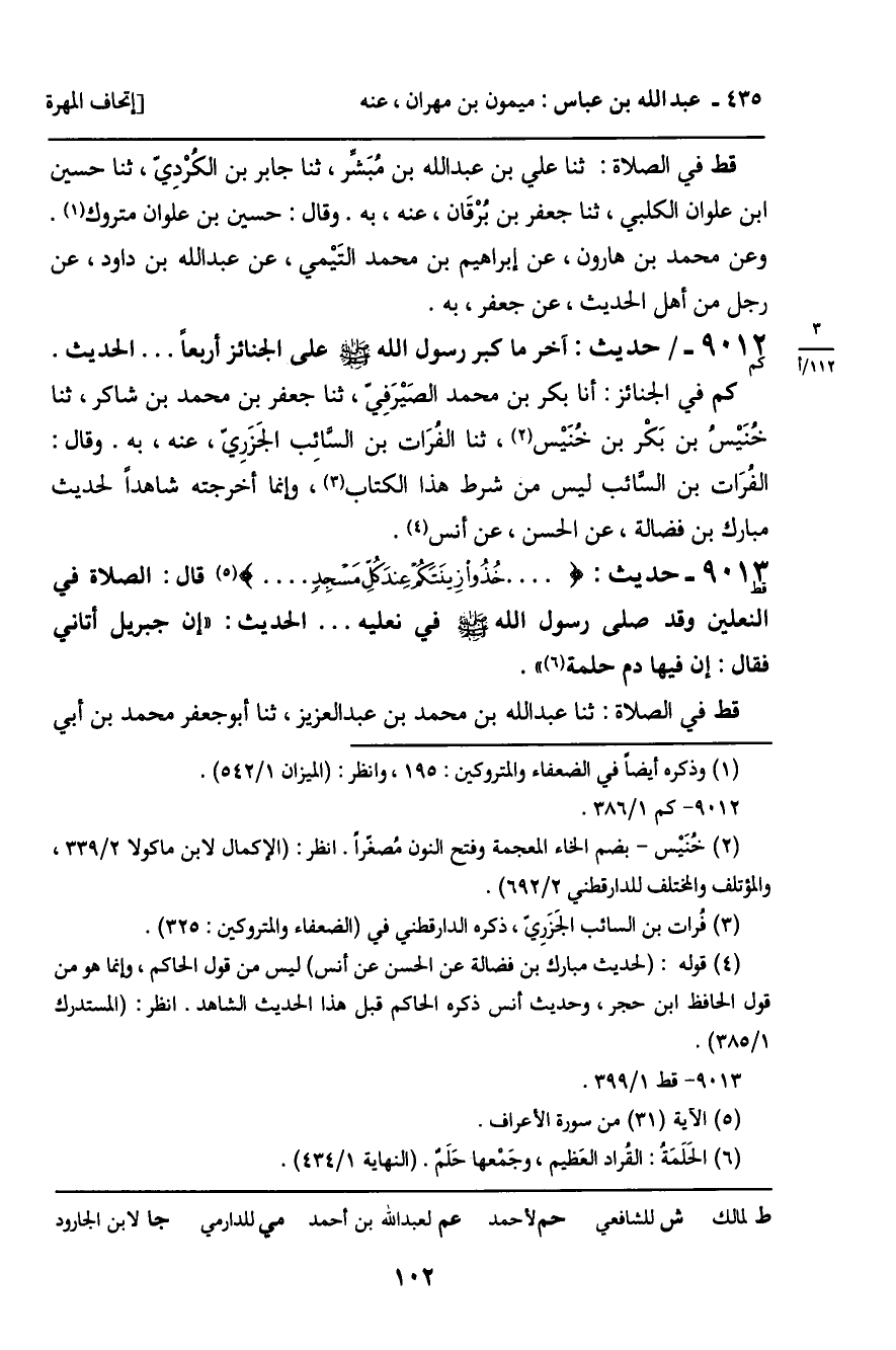 9013 - حَدِيثُ قط: " خُذُوا زِينَتَكُمْ عِنْدَ كُلِّ مَسْجِدٍ ... قَالَ: الصَّلاةُ فِي النَّعْلَيْنِ، وَقَدْ صَلَّى رَسُولُ اللَّهِ صَلَّى اللَّهُ عَلَيْهِ وَسَلَّمَ فِي نَعْلَيْهِ ... " الْحَدِيثَ: " إِنَّ جِبْرِيلَ أَتَانِي، فَقَالَ: إِنَّ فِيهَا دَمَ حَلَمَةٍ ".
