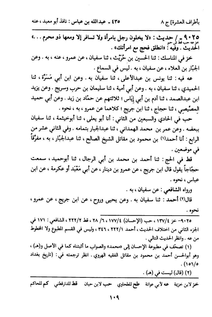 9025 - حَدِيثُ خز حب قطش حم: " لا يَخْلُوَنَّ رَجُلٌ بِامْرَأَةٍ وَلا تُسَافِرْ إِلا وَمَعَهَا ذُو مَحْرَمٍ ... " الْحَدِيثَ. وَفِيهِ: " انْطَلِقْ فَحُجَّ مَعَ امْرَأَتِكَ ".