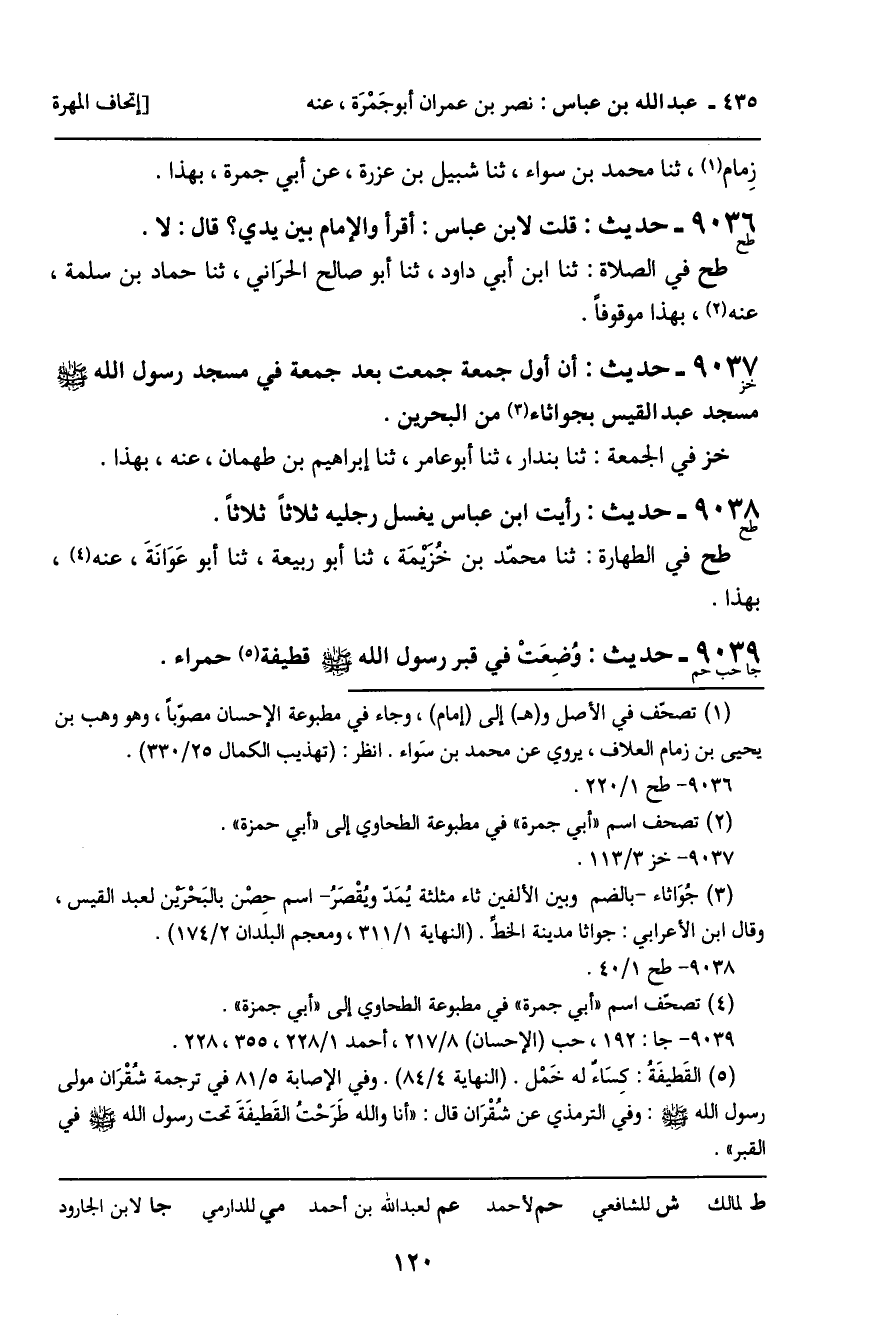 9039 - حَدِيثُ جا حب حم: " وَضَعْتُ فِي قَبْرِ رَسُولِ اللَّهِ صَلَّى اللَّهُ عَلَيْهِ وَسَلَّمَ قَطِيفَةً حَمْرَاءَ " الْحَدِيثَ.