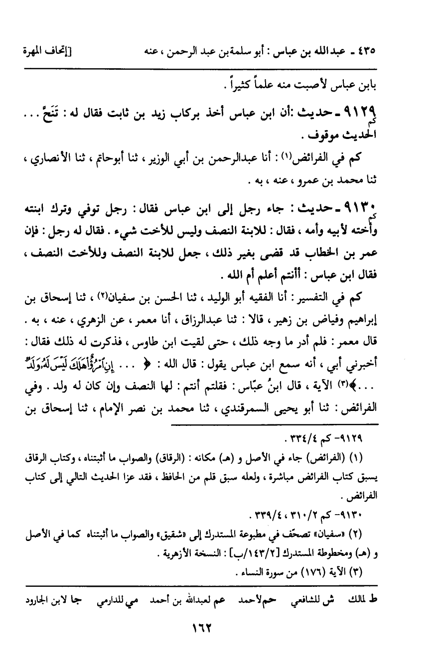 9129 - حَدِيثُ كم: " أَنَّ ابْنَ عَبَّاسٍ أَخَذَ بِرِكَابِ زَيْدِ بْنِ ثَابِتٍ فَقَالَ لَهُ: تَنَحَّ. . . " الْحَدِيثَ مَوْقُوفًا.