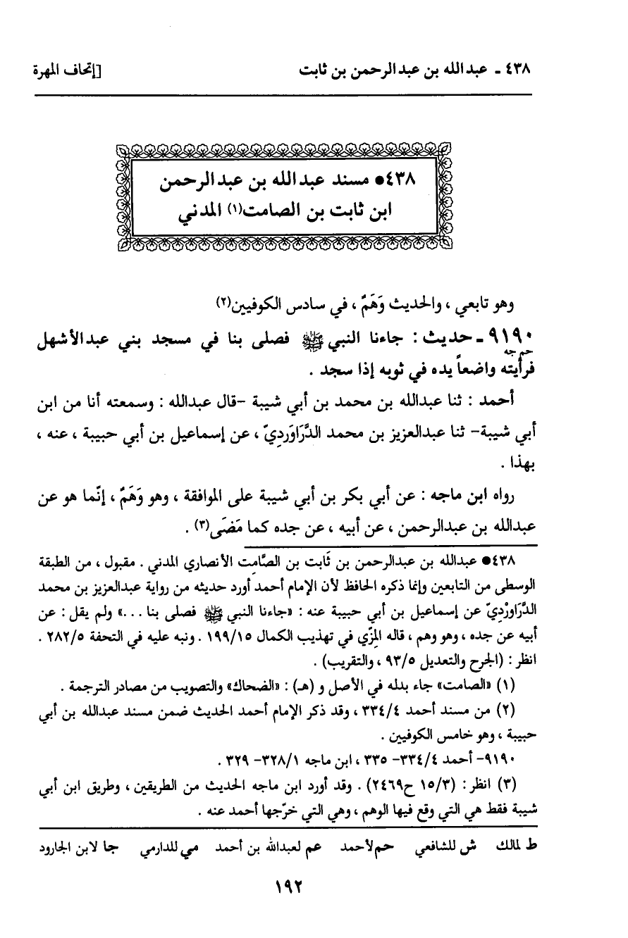 438 ـ مسند عَبْدِ اللَّهِ بْنِ عَبْدِ الرَّحْمَنِ بْنِ ثَابِتِ بْنِ الصَّامِتِ الْمَدَنِيِّ